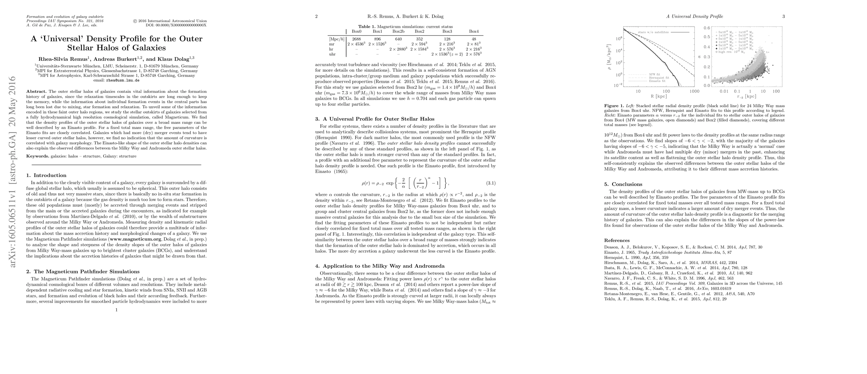The outer stellar halos of galaxies contain vital information about the formation history of galaxies, since the relaxation timescales in the outskirts are long enough to keep the memory, while the information about individual formation events in the central parts has long been lost due to mixing, star formation and relaxation. To unveil some of the information encoded in these faint outer halo regions, we study the stellar outskirts of galaxies selected from a fully hydrodynamical high resolution cosmological simulation, called Magneticum. We find that the density profiles of the outer stellar halos of galaxies over a broad mass range can be well described by an Einasto profile. For a fixed total mass range, the free parameters of the Einasto fits are closely correlated. Galaxies which had more (dry) merger events tend to have lesser curved outer stellar halos, however, we find no indication that the amount of curvature is correlated with galaxy morphology. The Einasto-like shape of the outer stellar halo densities can also explain the observed differences between the Milky Way and Andromeda outer stellar halos.