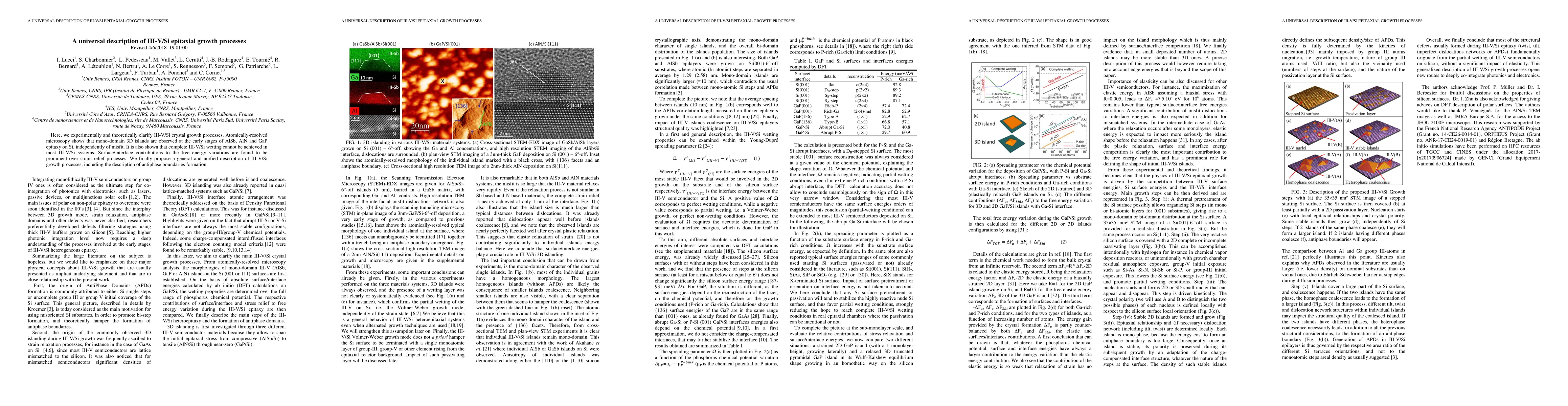 Here, we experimentally and theoretically clarify III-V/Si crystal growth processes. Atomically-resolved microscopy shows that mono-domain 3D islands are observed at the early stages of AlSb, AlN and GaP epitaxy on Si, independently of misfit. It is also shown that complete III-V/Si wetting cannot be achieved in most III-V/Si systems. Surface/interface contributions to the free energy variations are found to be prominent over strain relief processes. We finally propose a general and unified description of III-V/Si growth processes, including the description of antiphase boundaries formation.