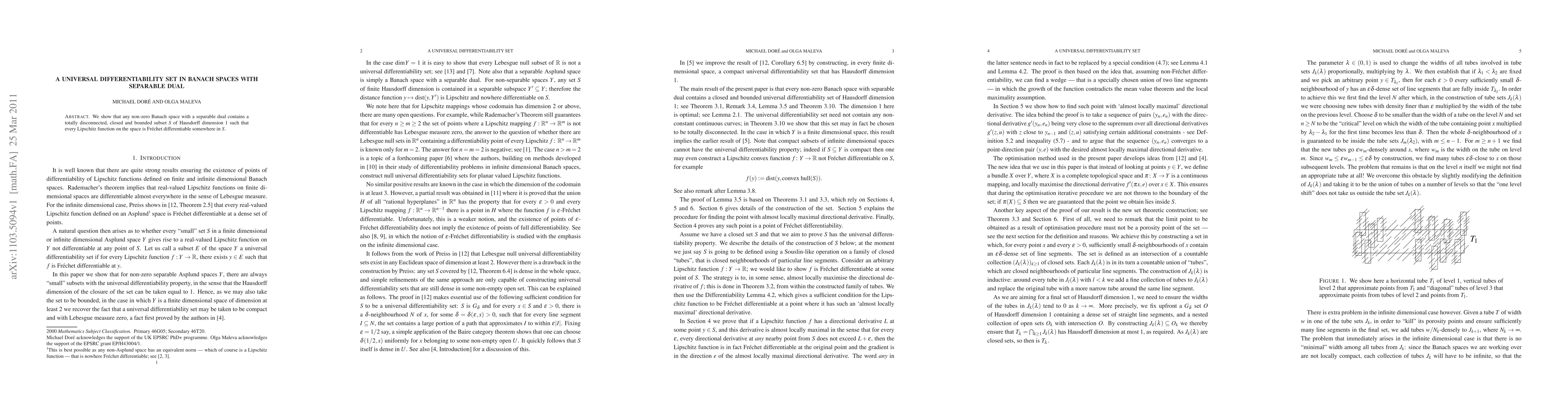 We show that any non-zero Banach space with a separable dual contains a totally disconnected, closed and bounded subset S of Hausdorff dimension 1 such that every Lipschitz function on the space is Fr\'echet differentiable somewhere in S.