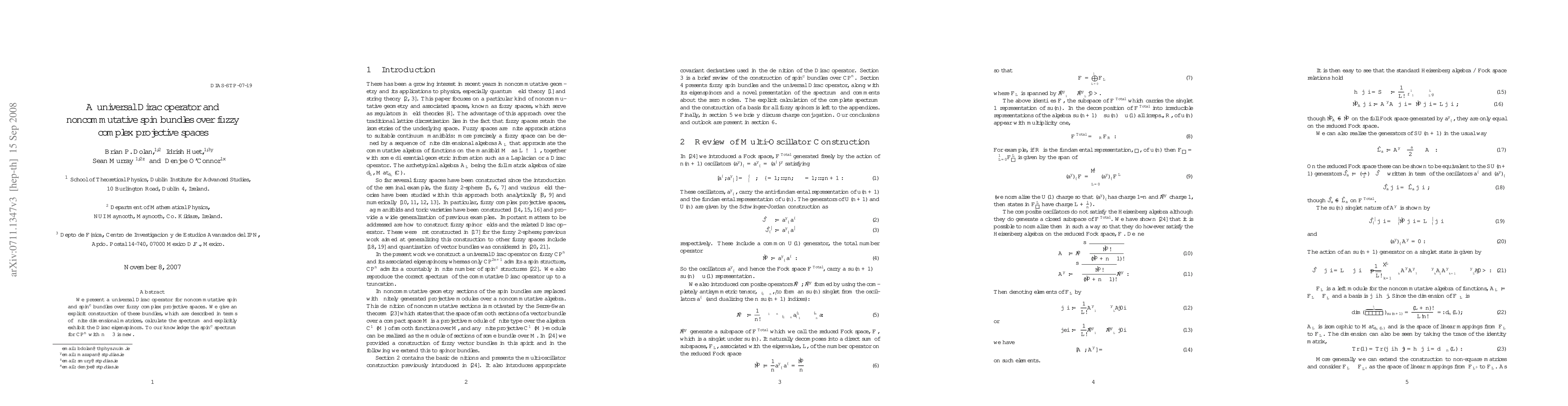 The paper introduces a universal Dirac operator for noncommutative spin and spin^c bundles over fuzzy complex projective spaces, constructing these bundles via finite dimensional matrices and presenting the novel spin^c spectrum for CP^n with n>=3. The Dirac eigenspinors are explicitly calculated.