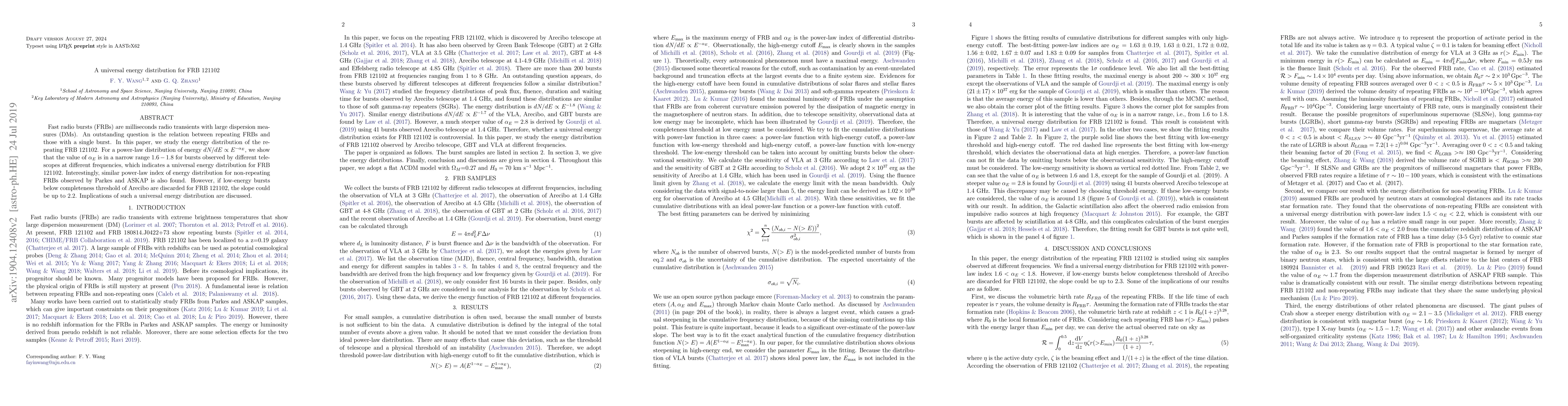 This paper investigates the energy distribution of the repeating FRB 121102, finding that the power-law index $\alpha_E$ ranges narrowly between 1.6 and 1.8, suggesting a universal energy distribution across different telescopes and frequencies. Similar findings are observed for non-repeating FRBs, though discarding low-energy bursts changes the distribution for FRB 121102.