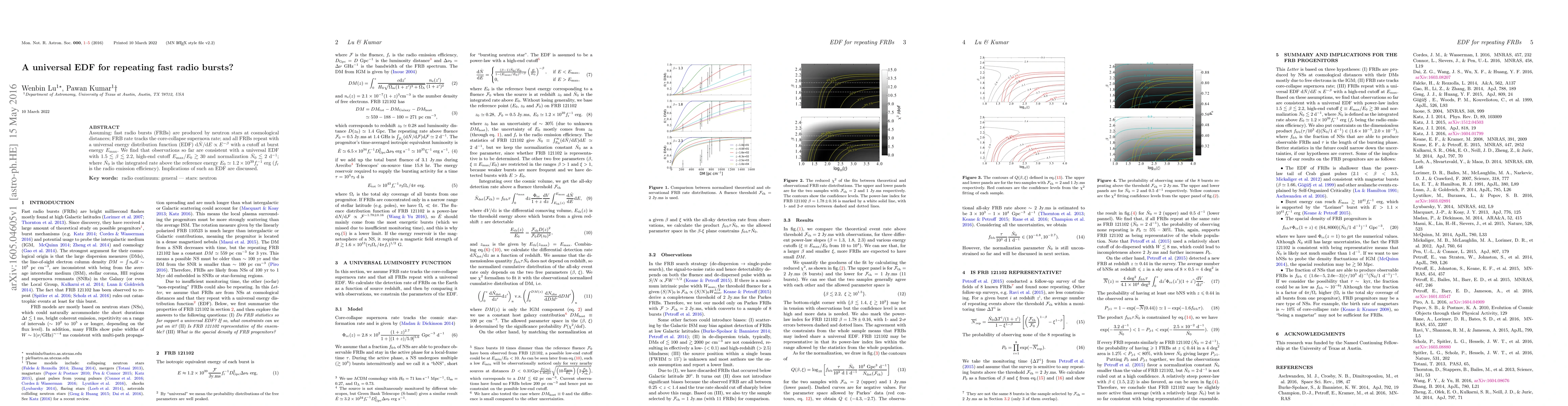 Assuming: fast radio bursts (FRBs) are produced by neutron stars at cosmological distances; FRB rate tracks core-collapse supernova rate; and all FRBs repeat with a universal energy distribution function (EDF) dN/dE ~ E^(-beta) with a high-end cutoff at burst energy E_max. We find that observations so far are consistent with a universal EDF with a power-law index 1.5 < beta < 2.2, high-end cutoff E_max/E_0 > 30 and normalization N_0 < 2 per day; where N_0 is the integrated rate above the reference burst energy E_0 = 1.2e39 f_r^(-1) erg (f_r is the radio emission efficiency). Implications of such an EDF are discussed.