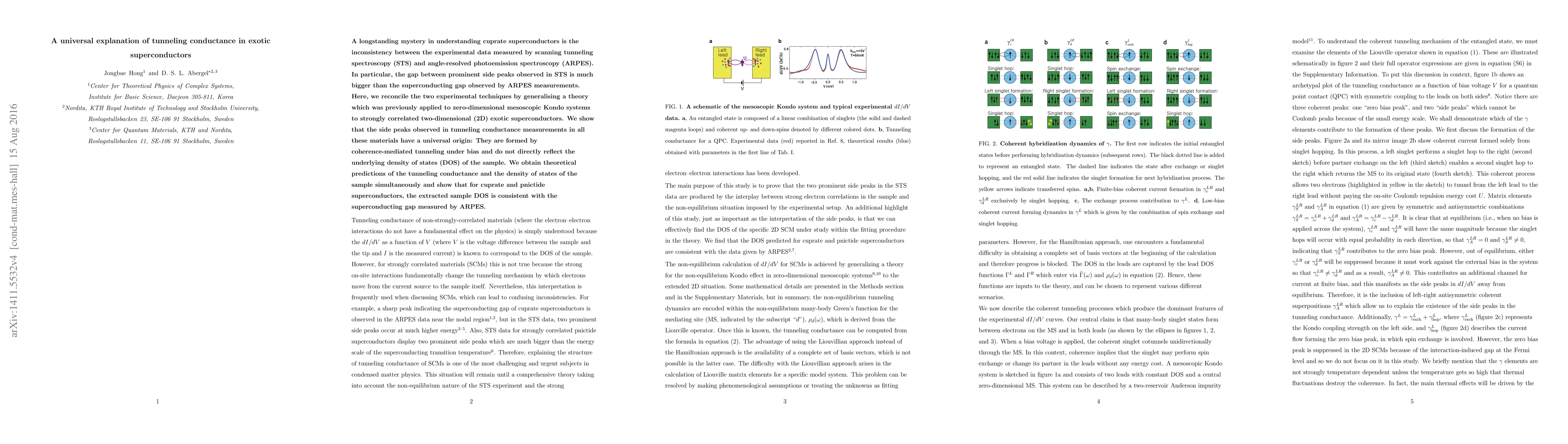 A longstanding mystery in understanding cuprate superconductors is the inconsistency between the experimental data measured by scanning tunneling spectroscopy (STS) and angle-resolved photoemission spectroscopy (ARPES). In particular, the gap between prominent side peaks observed in STS is much bigger than the superconducting gap observed by ARPES measurements. Here, we reconcile the two experimental techniques by generalising a theory which was previously applied to zero-dimensional mesoscopic Kondo systems to strongly correlated two-dimensional (2D) exotic superconductors. We show that the side peaks observed in tunneling conductance measurements in all these materials have a universal origin: They are formed by coherence-mediated tunneling under bias and do not directly reflect the underlying density of states (DOS) of the sample. We obtain theoretical predictions of the tunneling conductance and the density of states of the sample simultaneously and show that for cuprate and pnictide superconductors, the extracted sample DOS is consistent with the superconducting gap measured by ARPES.
