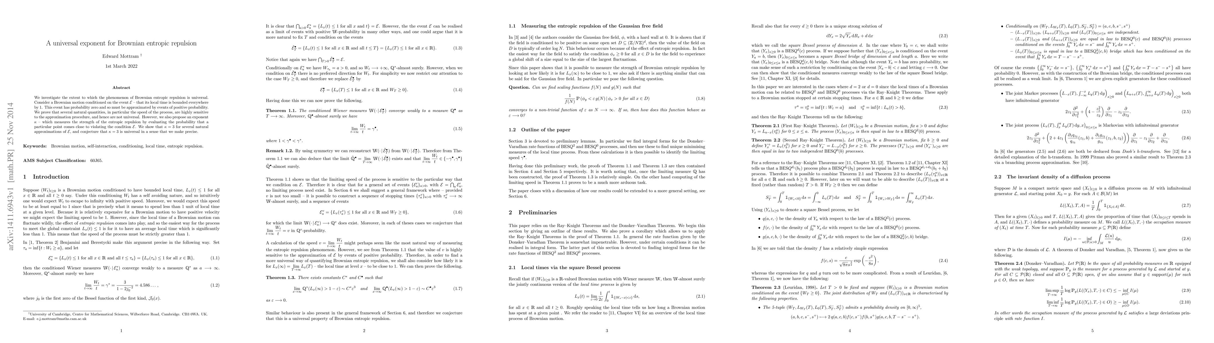 This paper explores the universality of Brownian entropic repulsion, demonstrating that while certain process speeds are not universal, a proposed exponent $\kappa$ measuring the strength of repulsion is universally $\kappa=3$ across various approximations.
