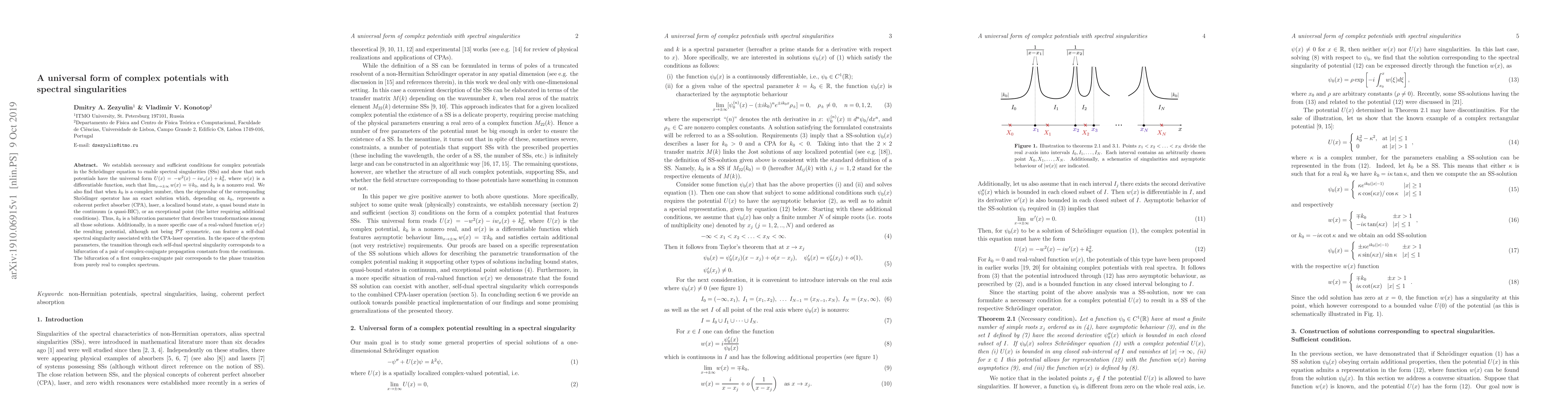 This paper identifies universal conditions for complex potentials in the Schrödinger equation to exhibit spectral singularities, revealing a potential form $U(x) = -w^2(x) - iw_x(x) + k_0^2$. The parameter $k_0$ dictates various physical outcomes, including coherent perfect absorption, laser operation, and exceptional points, highlighting its role as a bifurcation parameter.