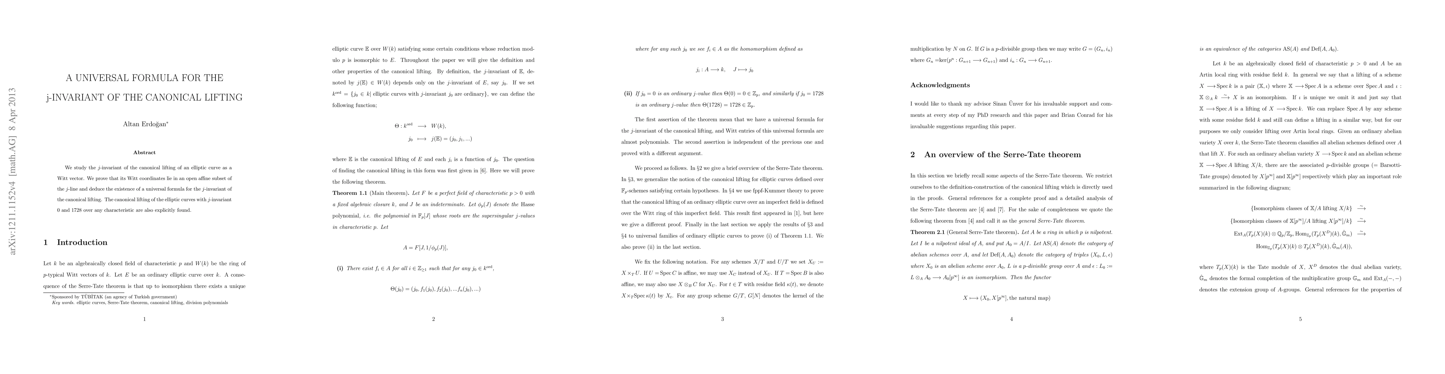 This paper proves a universal formula for the j-invariant of the canonical lifting of elliptic curves expressed as Witt vectors, showing that their Witt coordinates reside in an open affine subset of the j-line. It also explicitly determines the canonical liftings for elliptic curves with j-invariants 0 and 1728 across any characteristic.