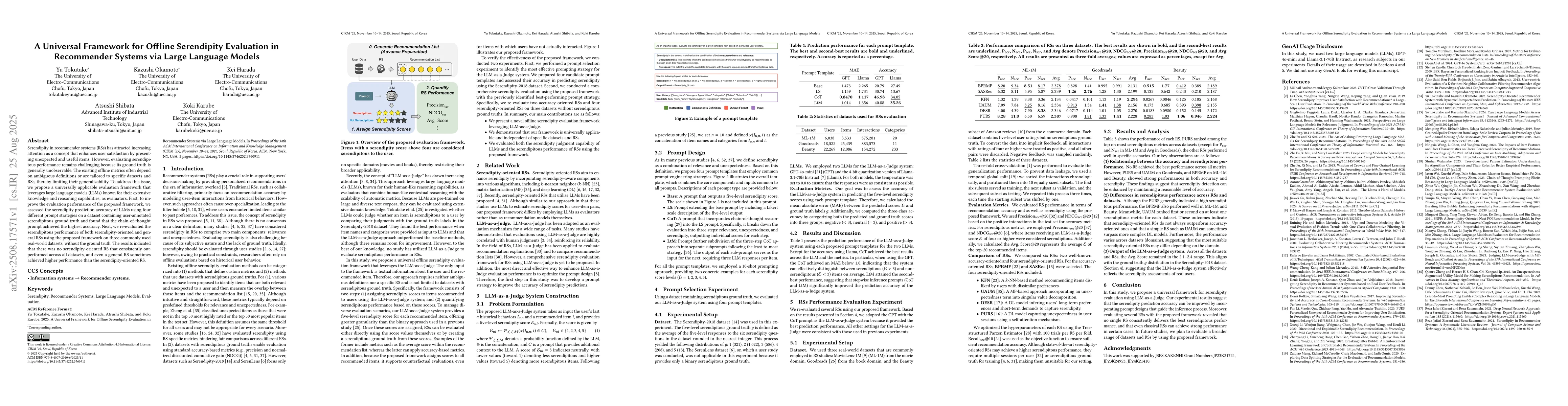 Serendipity in recommender systems (RSs) has attracted increasing attention as a concept that enhances user satisfaction by presenting unexpected and useful items. However, evaluating serendipitous performance remains challenging because its ground truth is generally unobservable. The existing offline metrics often depend on ambiguous definitions or are tailored to specific datasets and RSs, thereby limiting their generalizability. To address this issue, we propose a universally applicable evaluation framework that leverages large language models (LLMs) known for their extensive knowledge and reasoning capabilities, as evaluators. First, to improve the evaluation performance of the proposed framework, we assessed the serendipity prediction accuracy of LLMs using four different prompt strategies on a dataset containing user-annotated serendipitous ground truth and found that the chain-of-thought prompt achieved the highest accuracy. Next, we re-evaluated the serendipitous performance of both serendipity-oriented and general RSs using the proposed framework on three commonly used real-world datasets, without the ground truth. The results indicated that there was no serendipity-oriented RS that consistently outperformed across all datasets, and even a general RS sometimes achieved higher performance than the serendipity-oriented RS.