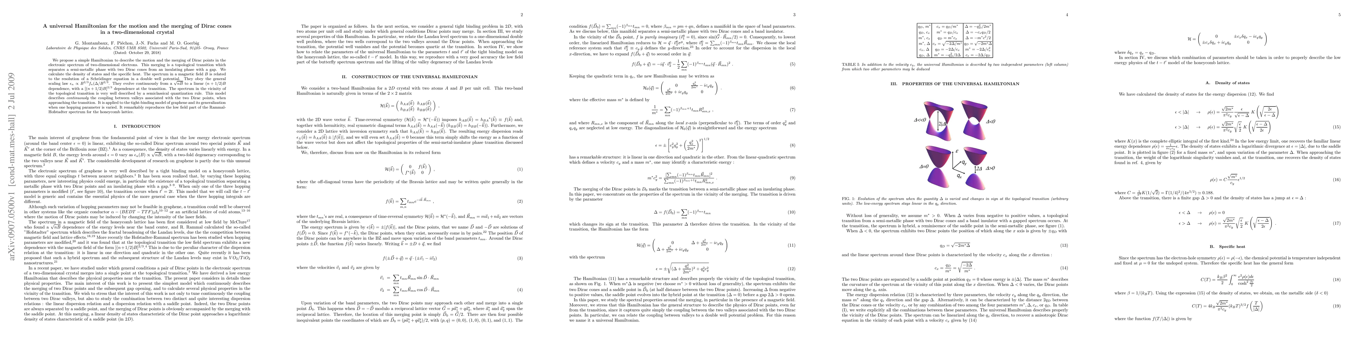 This paper proposes a Hamiltonian to describe the motion and merging of Dirac cones in two-dimensional crystals, highlighting a topological transition from a semi-metallic to an insulating phase. The model accurately captures the spectrum's evolution and applies to graphene, reproducing the Rammal-Hofstadter spectrum under low magnetic fields.