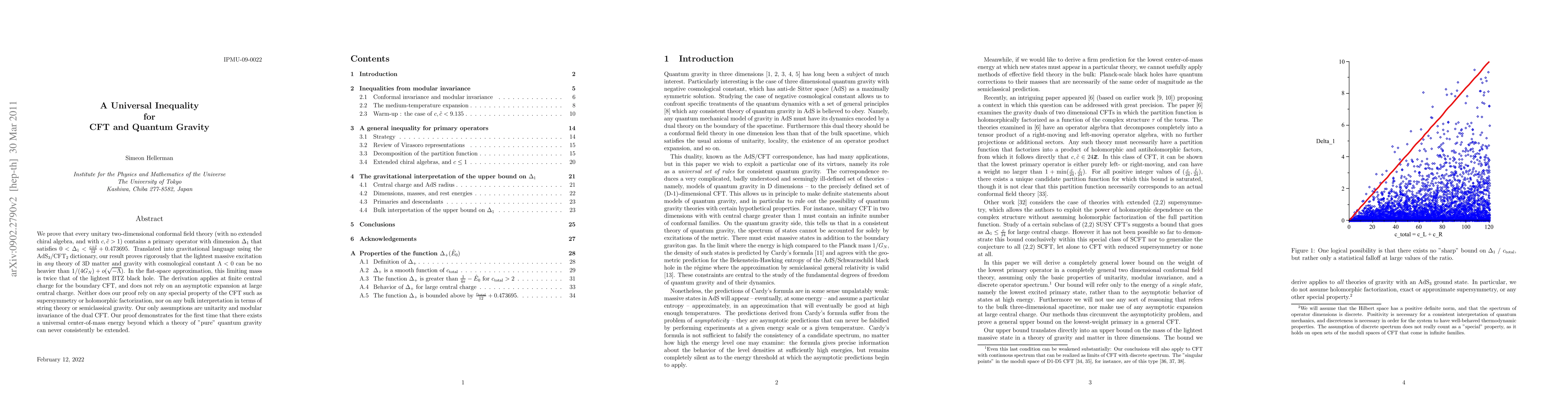 Researchers prove a universal inequality for 2D conformal field theories and 3D gravity theories, showing that the lightest massive excitation in any theory of quantum gravity cannot be heavier than a certain threshold.