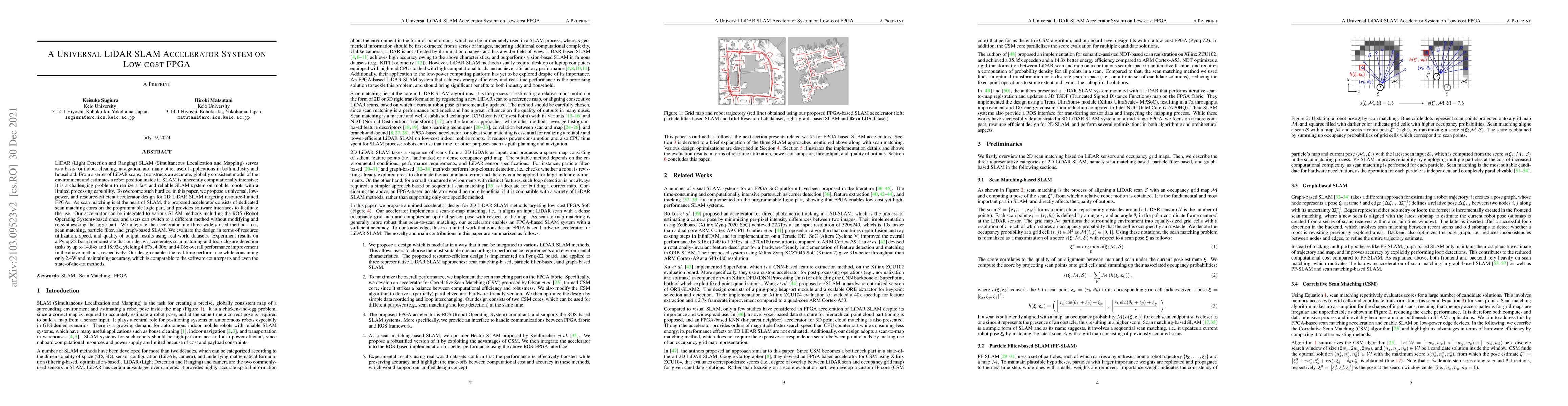 This paper proposes a universal, low-power FPGA-based accelerator for 2D LiDAR SLAM, significantly speeding up scan matching and loop-closure detection. The design integrates with various SLAM methods and achieves up to 18.92x acceleration in specific tasks while maintaining real-time performance and comparable accuracy.