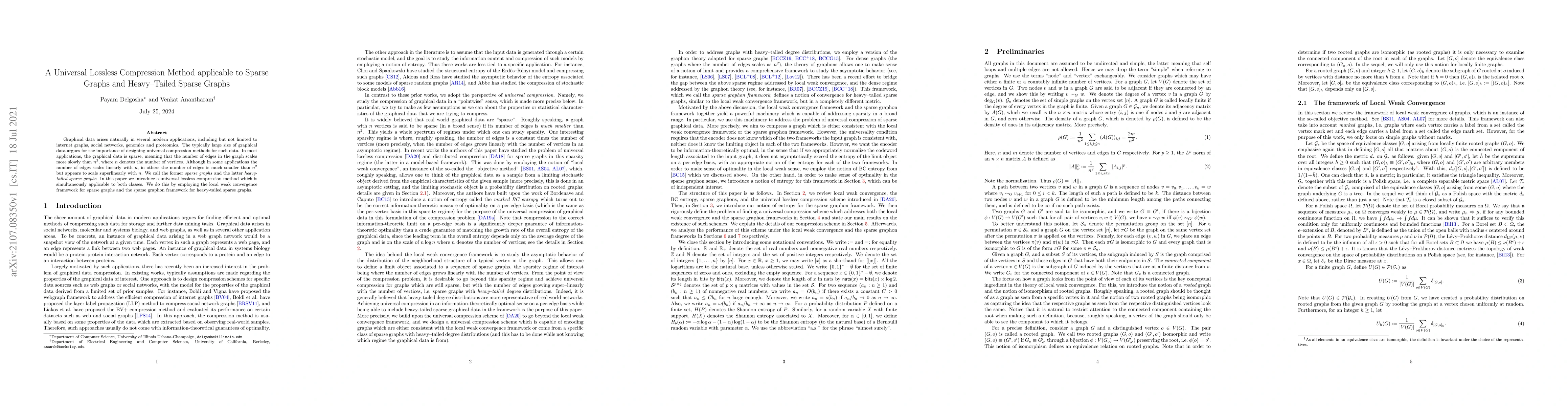 This paper presents a universal lossless compression method for sparse and heavy-tailed sparse graphs, leveraging the local weak convergence and sparse graphon frameworks to handle different scaling behaviors of edges in graph data. The method aims to efficiently compress large graphical data from applications like internet graphs and social networks.