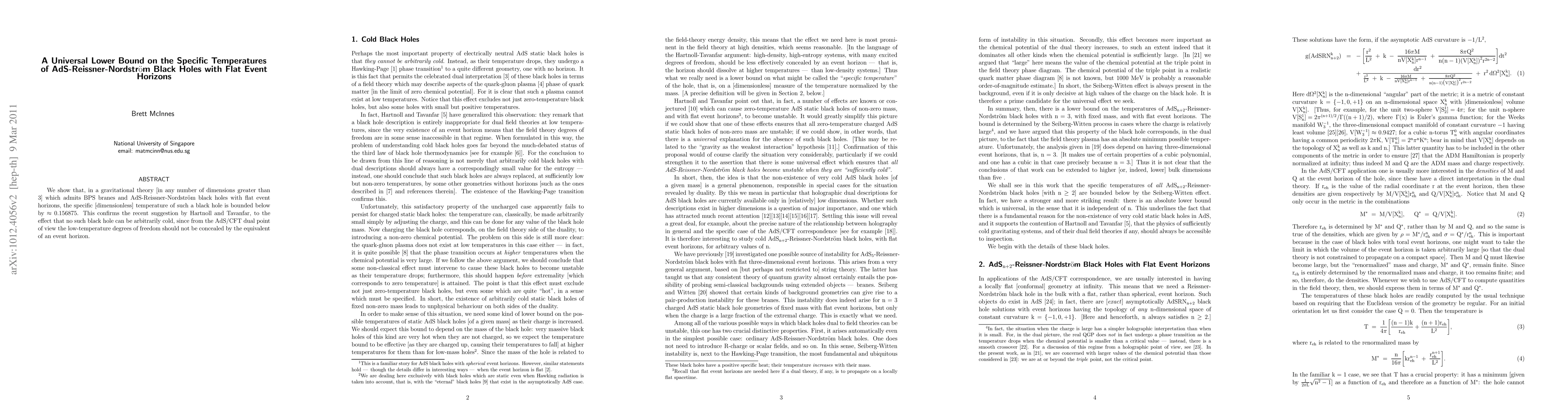 We show that, in a gravitational theory [in any number of dimensions greater than 3] which admits BPS branes and AdS-Reissner-Nordstrom black holes with flat event horizons, the specific [dimensionless] temperature of such a black hole is bounded below by approximately 0.156875. This confirms the recent suggestion by Hartnoll and Tavanfar, to the effect that no such black hole can be arbitrarily cold, since from the AdS/CFT dual point of view the low-temperature degrees of freedom should not be concealed by the equivalent of an event horizon.