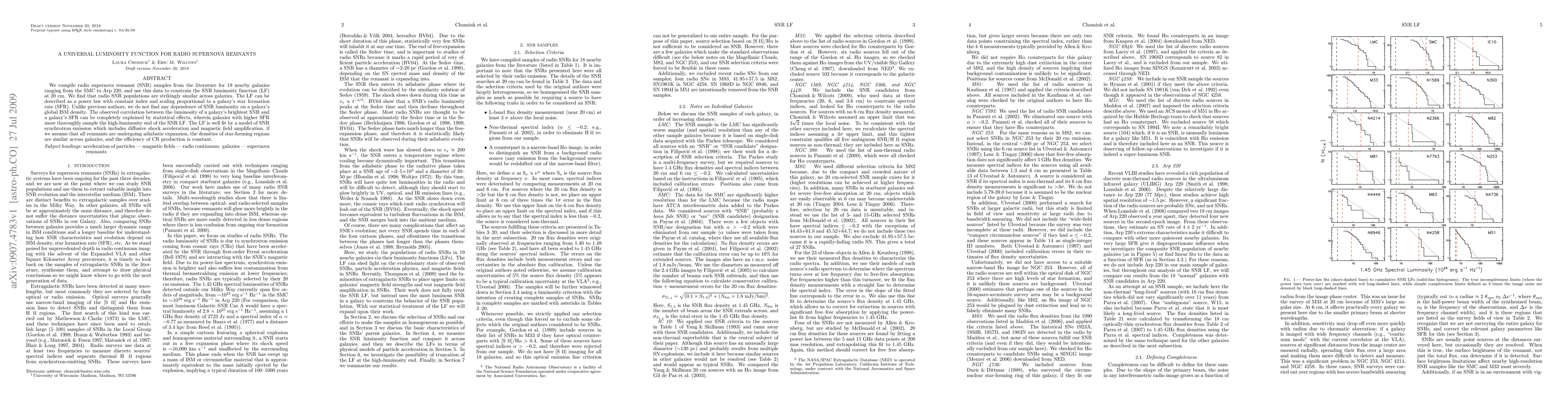 This study compiles radio supernova remnant samples from 19 nearby galaxies to derive a universal luminosity function, finding a consistent power-law shape across galaxies that scales with star formation rate. The authors conclude that the luminosity correlation with star formation rate is due to statistical sampling rather than ISM density effects.