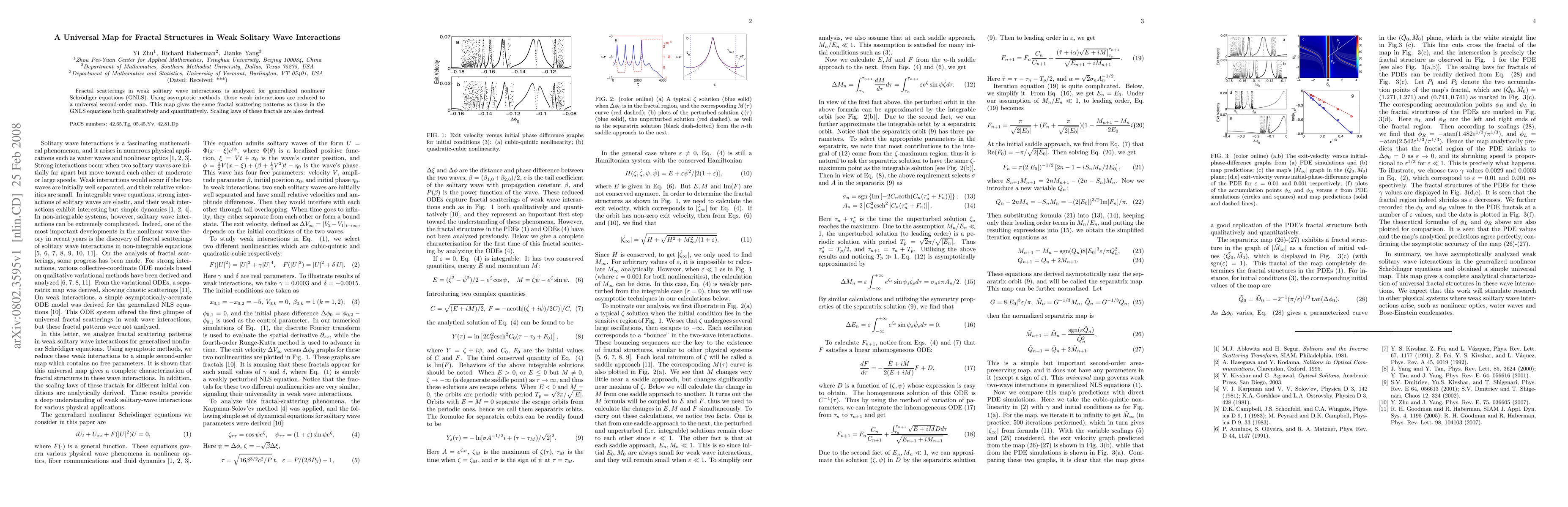 This paper analyzes fractal scattering patterns in weak solitary wave interactions governed by generalized nonlinear Schrödinger equations (GNLS). It derives a universal second-order map that accurately describes these patterns, providing both qualitative and quantitative agreement with the GNLS equations, and also establishes scaling laws for the fractals.