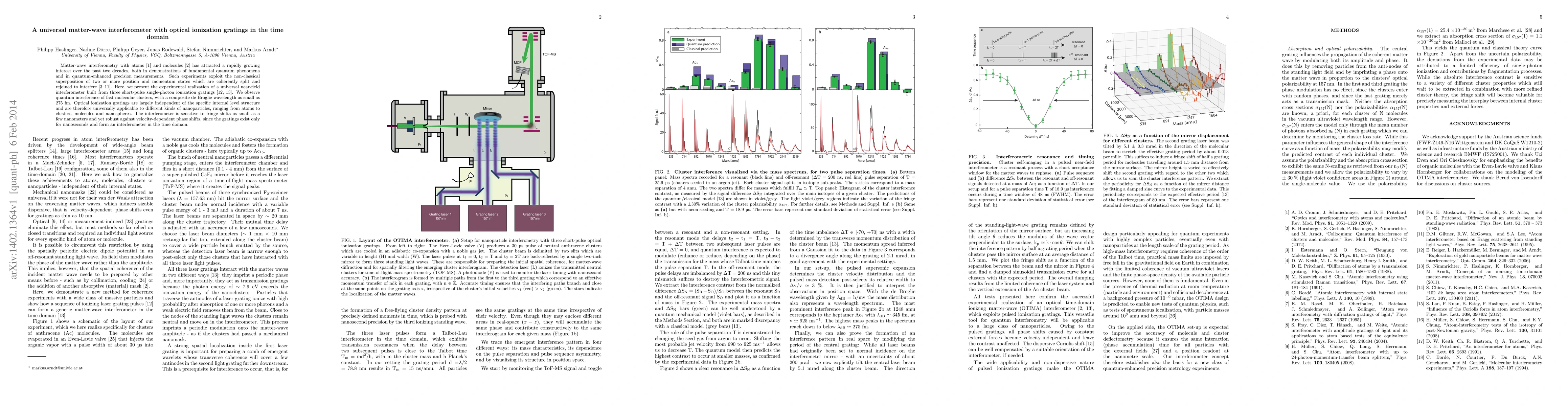 Matter-wave interferometry with atoms and molecules has attracted a rapidly growing interest over the past two decades, both in demonstrations of fundamental quantum phenomena and in quantum-enhanced precision measurements. Such experiments exploit the non-classical superposition of two or more position and momentum states which are coherently split and rejoined to interfere. Here, we present the experimental realization of a universal near-field interferometer built from three short-pulse single-photon ionization gratings. We observe quantum interference of fast molecular clusters, with a composite de Broglie wavelength as small as 275 fm. Optical ionization gratings are largely independent of the specific internal level structure and are therefore universally applicable to different kinds of nanoparticles, ranging from atoms to clusters, molecules and nanospheres. The interferometer is sensitive to fringe shifts as small as a few nanometers and yet robust against velocity-dependent phase shifts, since the gratings exist only for nanoseconds and form an interferometer in the time domain.