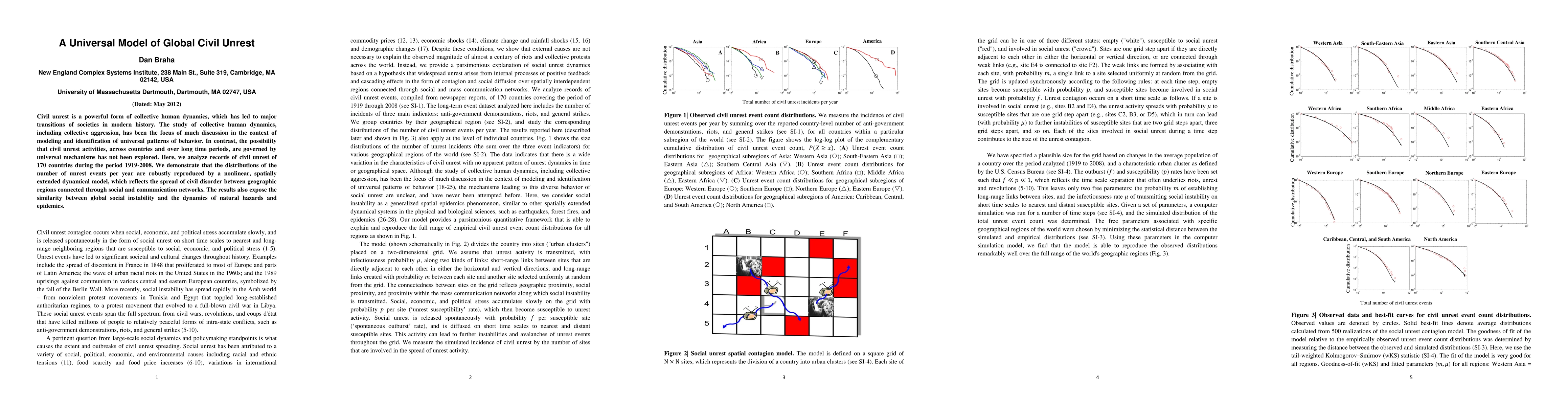 This paper develops a universal model to identify common mechanisms governing global civil unrest across countries from 1919-2008, showing that the distribution of unrest events follows a pattern replicated by a nonlinear, spatially extended dynamical model, akin to natural hazards and epidemics.