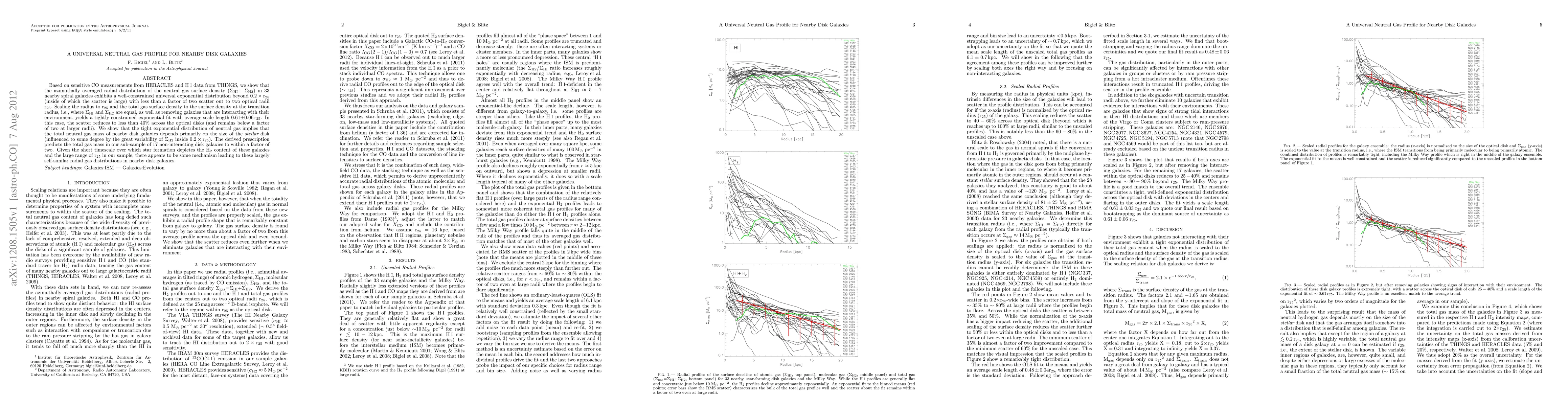 Based on sensitive CO measurements from HERACLES and HI data from THINGS, we show that the azimuthally averaged radial distribution of the neutral gas surface density (Sigma_HI + Sigma_H2) in 33 nearby spiral galaxies exhibits a well-constrained universal exponential distribution beyond 0.2*r25 (inside of which the scatter is large) with less than a factor of two scatter out to two optical radii r25. Scaling the radius to r25 and the total gas surface density to the surface density at the transition radius, i.e., where Sigma_HI and Sigma_H2 are equal, as well as removing galaxies that are interacting with their environment, yields a tightly constrained exponential fit with average scale length 0.61+-0.06 r25. In this case, the scatter reduces to less than 40% across the optical disks (and remains below a factor of two at larger radii). We show that the tight exponential distribution of neutral gas implies that the total neutral gas mass of nearby disk galaxies depends primarily on the size of the stellar disk (influenced to some degree by the great variability of Sigma_H2 inside 0.2*r25). The derived prescription predicts the total gas mass in our sub-sample of 17 non-interacting disk galaxies to within a factor of two. Given the short timescale over which star formation depletes the H2 content of these galaxies and the large range of r25 in our sample, there appears to be some mechanism leading to these largely self-similar radial gas distributions in nearby disk galaxies.