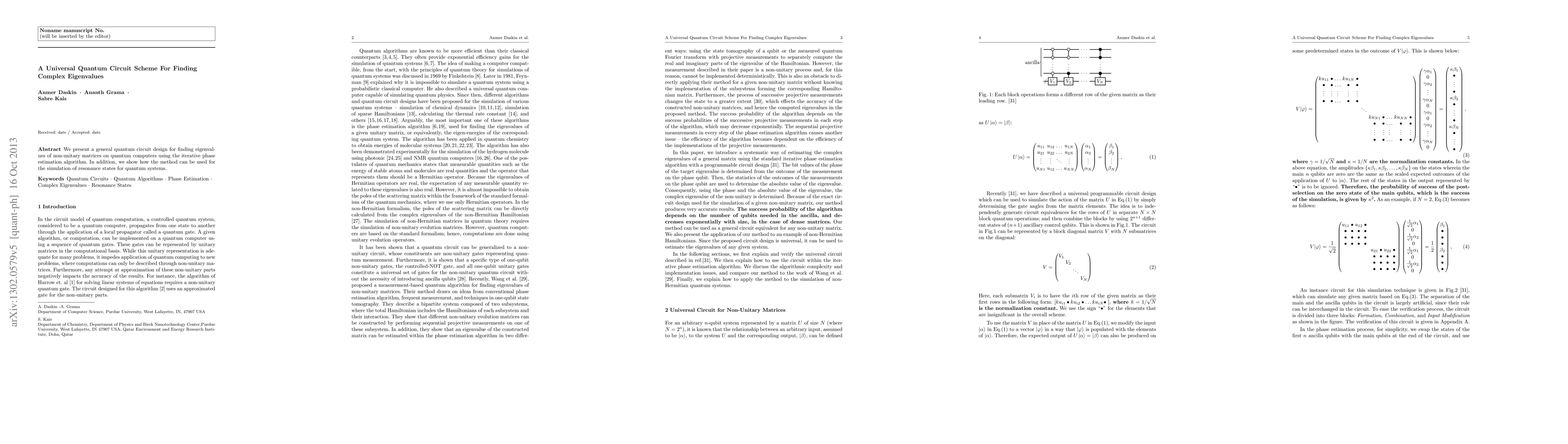 This paper introduces a universal quantum circuit scheme leveraging iterative phase estimation to determine complex eigenvalues of non-unitary matrices, with applications to simulating resonance states in quantum systems. The method enhances the capability of quantum computers to analyze complex quantum dynamics.