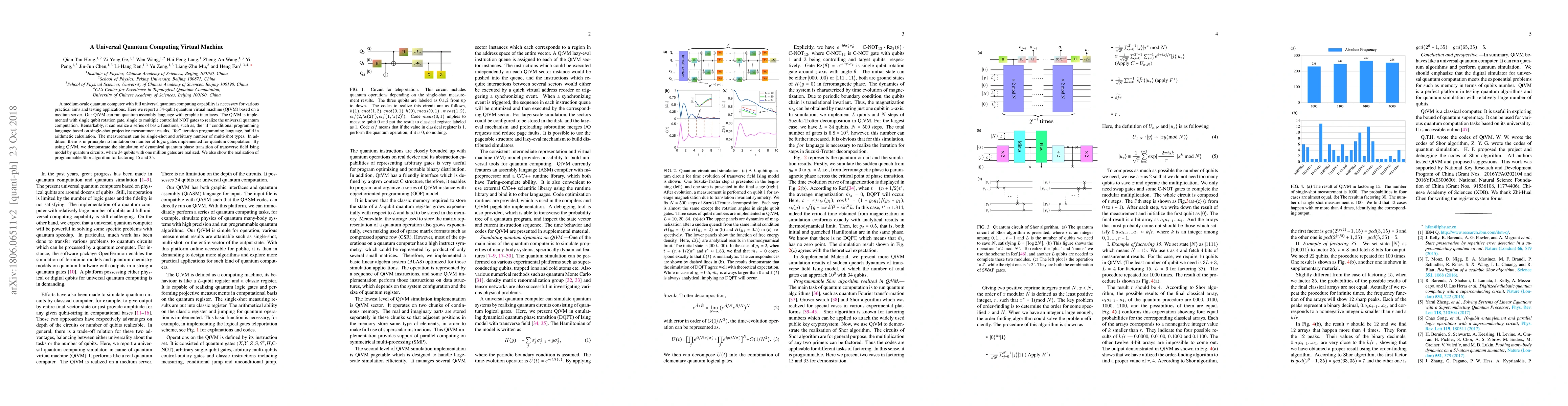 A medium-scale quantum computer with full universal quantum computing capability is necessary for various practical aims and testing applications. Here we report a 34-qubit quantum virtual machine (QtVM) based on a medium server. Our QtVM can run quantum assembly language with graphic interfaces. The QtVM is implemented with single qubit rotation gate, single to multiple controlled NOT gates to realize the universal quantum computation. Remarkably, it can realize a series of basic functions, such as, the "if" conditional programming language based on single-shot projective measurement results, "for" iteration programming language, build in arithmetic calculation. The measurement can be single-shot and arbitrary number of multi-shot types. In addition, there is in principle no limitation on number of logic gates implemented for quantum computation. By using QtVM, we demonstrate the simulation of dynamical quantum phase transition of transverse field Ising model by quantum circuits, where 34 qubits with one million gates are realized. We also show the realization of programmable Shor algorithm for factoring 15 and 35.