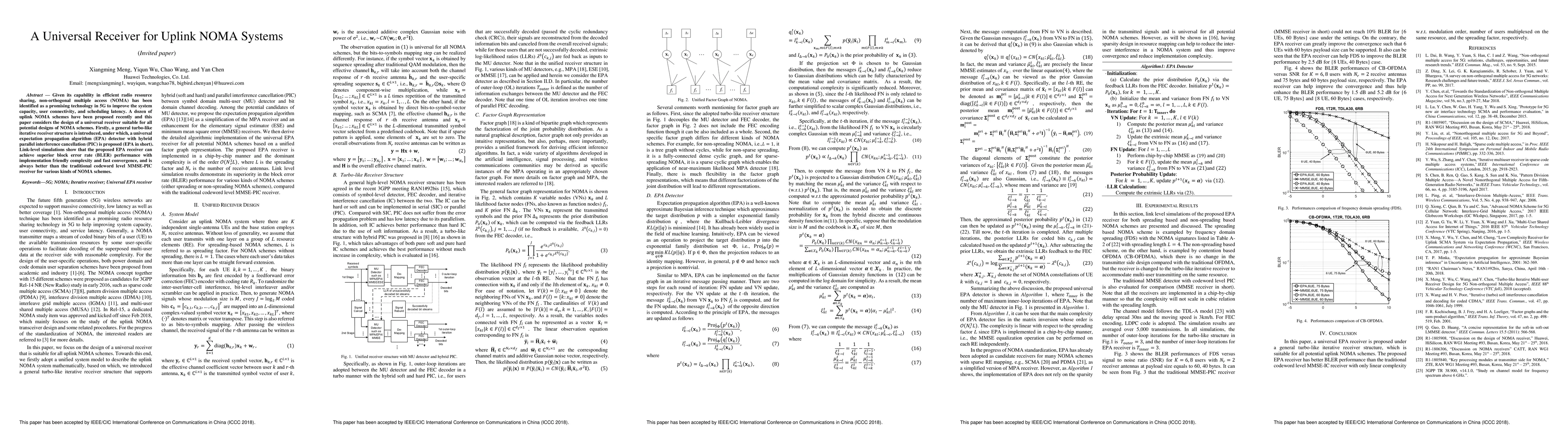 This paper proposes a universal receiver for uplink NOMA systems, introducing a turbo-like iterative receiver structure with a hybrid parallel interference cancellation expectation propagation algorithm (EPA). The EPA receiver demonstrates superior block error rate performance compared to traditional MMSE-PIC receivers, with lower complexity and faster convergence.