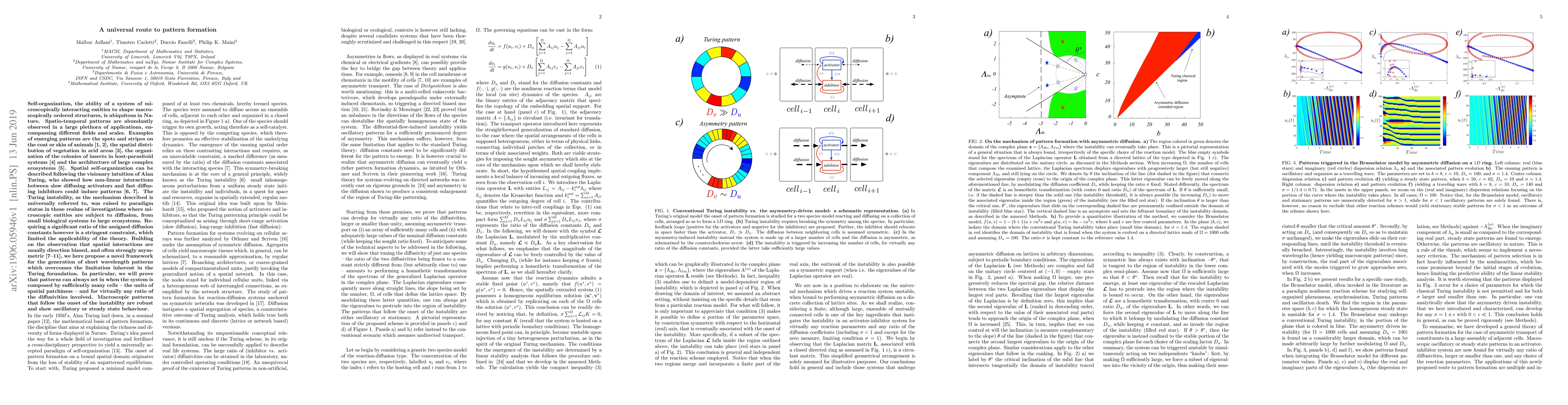 Self-organization, the ability of a system of microscopically interacting entities to shape macroscopically ordered structures, is ubiquitous in Nature. Spatio-temporal patterns are abundantly observed in a large plethora of applications, encompassing different fields and scales. Examples of emerging patterns are the spots and stripes on the coat or skin of animals, the spatial distribution of vegetation in arid areas, the organization of the colonies of insects in host-parasitoid systems and the architecture of large complex ecosystems. Spatial self-organization can be described following the visionary intuition of Alan Turing, who showed how non-linear interactions between slow diffusing activators and fast diffusing inhibitors could induce patterns. The Turing instability, as the mechanism described is universally referred to, was raised to paradigm status in those realms of investigations where microscopic entities are subject to diffusion, from small biological systems to large ecosystems. Requiring a significant ratio of the assigned diffusion constants however is a stringent constraint, which limited the applicability of the theory. Building on the observation that spatial interactions are usually direction biased, and often strongly asymmetric, we here propose a novel framework for the generation of short wavelength patterns which overcomes the limitation inherent in the Turing formulation. In particular, we will prove that patterns can always set in when the system is composed by sufficiently many cells - the units of spatial patchiness - and for virtually any ratio of the diffusivities involved. Macroscopic patterns that follow the onset of the instability are robust and show oscillatory or steady-state behavior.