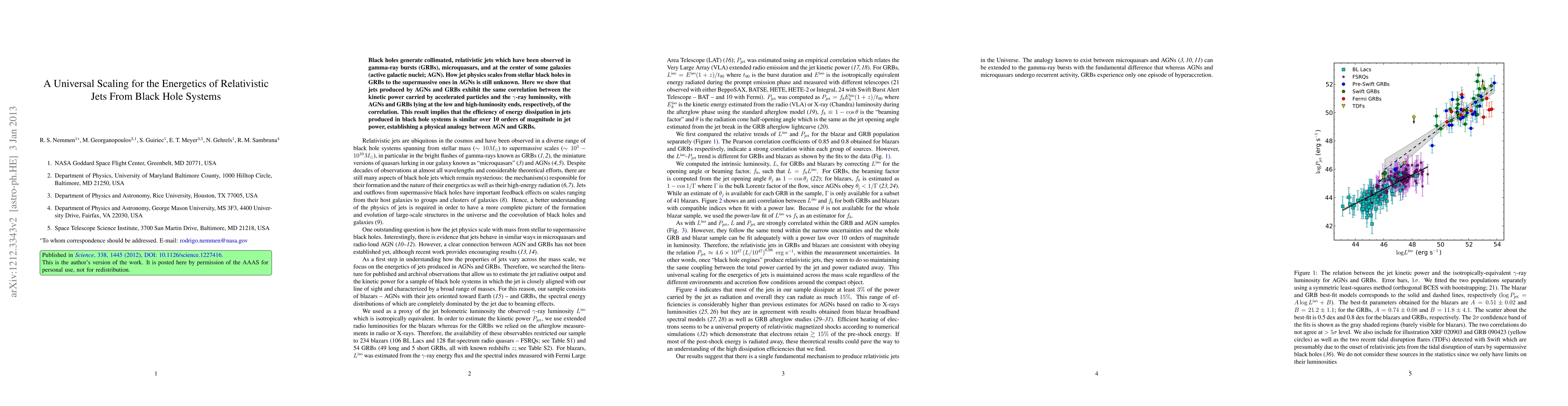 This paper demonstrates a universal scaling relationship between the kinetic power of relativistic jets from black holes and their gamma-ray luminosity, suggesting similar energy dissipation efficiencies across jets from stellar-mass black holes in gamma-ray bursts to supermassive black holes in active galactic nuclei. This finding highlights a physical analogy between these vastly different astrophysical phenomena.