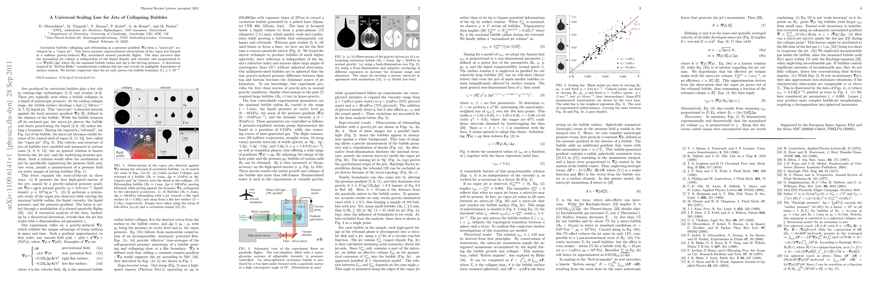 Researchers discovered a universal scaling law for jets formed when cavitation bubbles collapse, found to be independent of liquid density and viscosity, with volume proportional to pressure gradient and bubble radius.