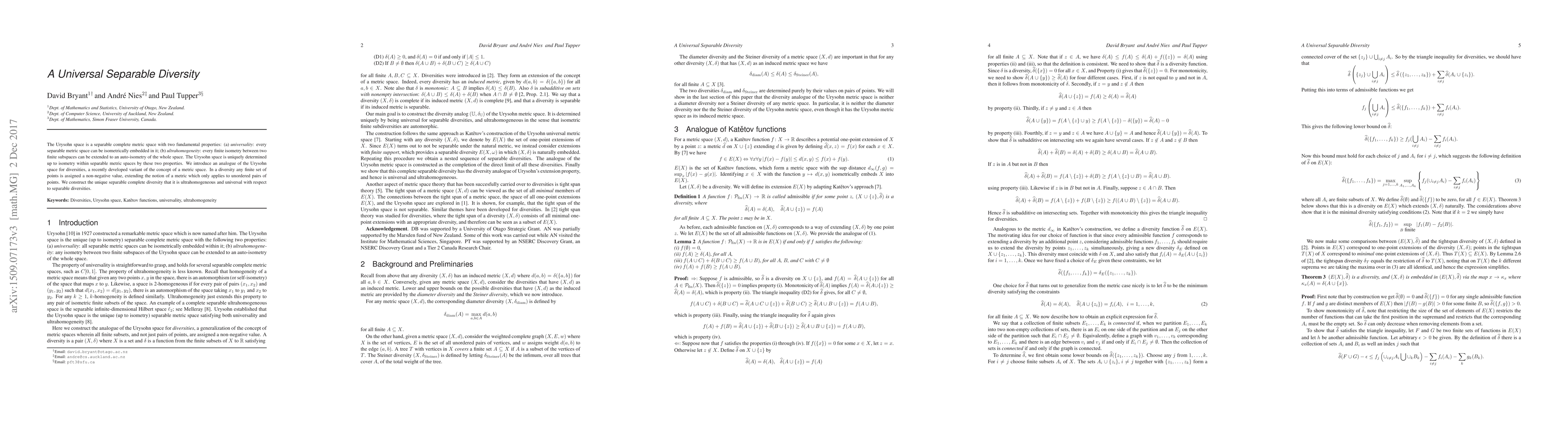 The Urysohn space is a separable complete metric space with two fundamental properties: (a) universality: every separable metric space can be isometrically embedded in it; (b) ultrahomogeneity: every finite isometry between two finite subspaces can be extended to an auto-isometry of the whole space. The Urysohn space is uniquely determined up to isometry within separable metric spaces by these two properties. We introduce an analogue of the Urysohn space for diversities, a recently developed variant of the concept of a metric space. In a diversity any finite set of points is assigned a non-negative value, extending the notion of a metric which only applies to unordered pairs of points. We construct the unique separable complete diversity that it is ultrahomogeneous and universal with respect to separable diversities.