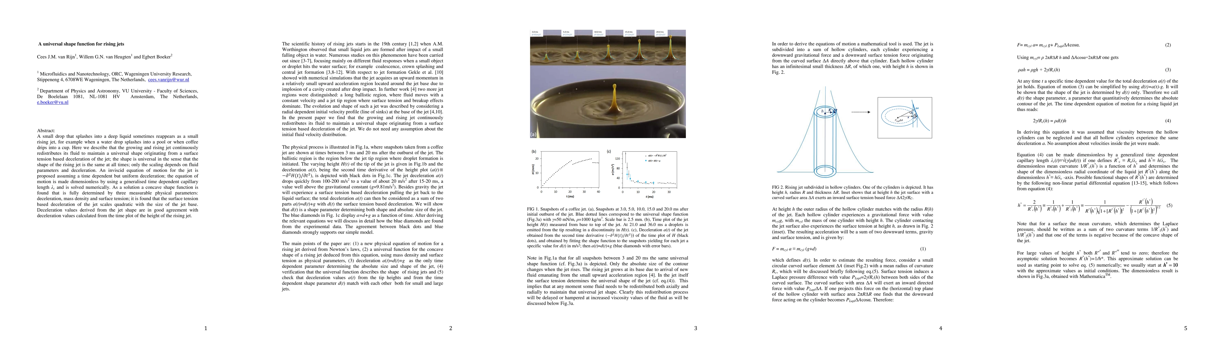 This paper proposes a universal shape function for rising jets formed by splashing droplets, showing that these jets maintain a consistent shape due to surface tension-based deceleration. The study derives an inviscid equation of motion, solved numerically to reveal a concave shape function determined by deceleration, mass density, and surface tension.