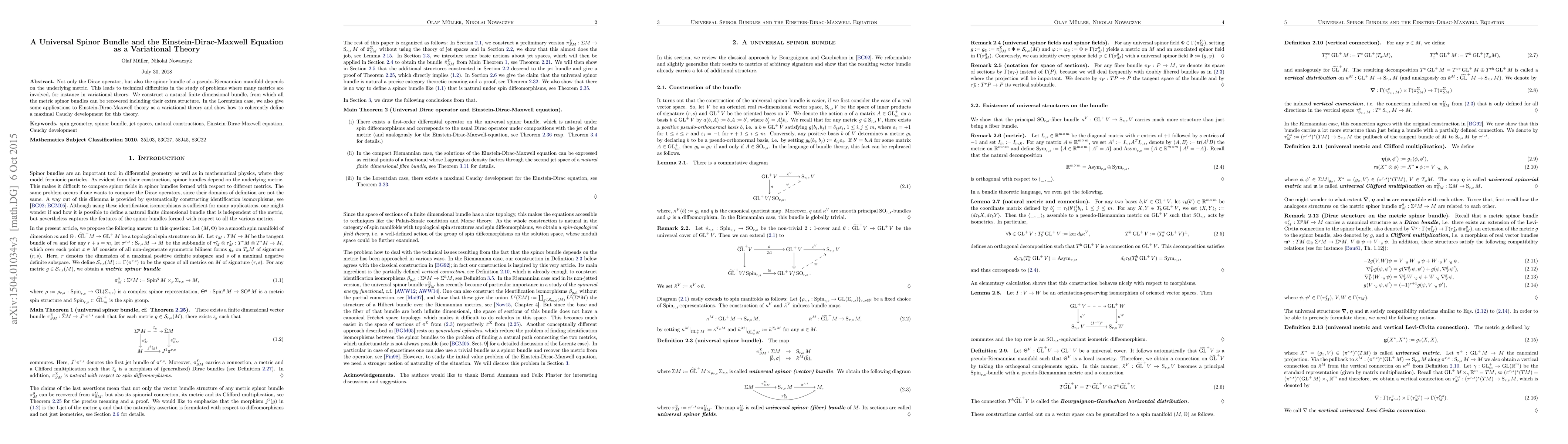 This paper constructs a universal spinor bundle that encompasses all metric spinor bundles, addressing technical difficulties in variational theory involving multiple metrics. It applies this framework to the Einstein-Dirac-Maxwell theory, providing a coherent definition for its maximal Cauchy development.