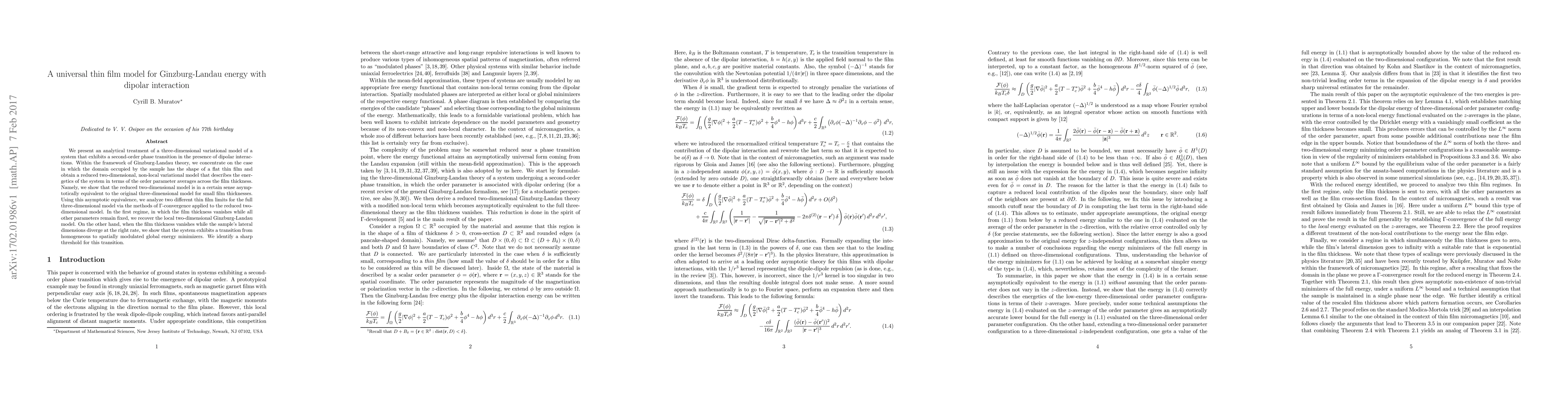 We present an analytical treatment of a three-dimensional variational model of a system that exhibits a second-order phase transition in the presence of dipolar interactions. Within the framework of Ginzburg-Landau theory, we concentrate on the case in which the domain occupied by the sample has the shape of a flat thin film and obtain a reduced two-dimensional, non-local variational model that describes the energetics of the system in terms of the order parameter averages across the film thickness. Namely, we show that the reduced two-dimensional model is in a certain sense asymptotically equivalent to the original three-dimensional model for small film thicknesses. Using this asymptotic equivalence, we analyze two different thin film limits for the full three-dimensional model via the methods of $\Gamma$-convergence applied to the reduced two-dimensional model. In the first regime, in which the film thickness vanishes while all other parameters remain fixed, we recover the local two-dimensional Ginzburg-Landau model. On the other hand, when the film thickness vanishes while the sample's lateral dimensions diverge at the right rate, we show that the system exhibits a transition from homogeneous to spatially modulated global energy minimizers. We identify a sharp threshold for this transition.