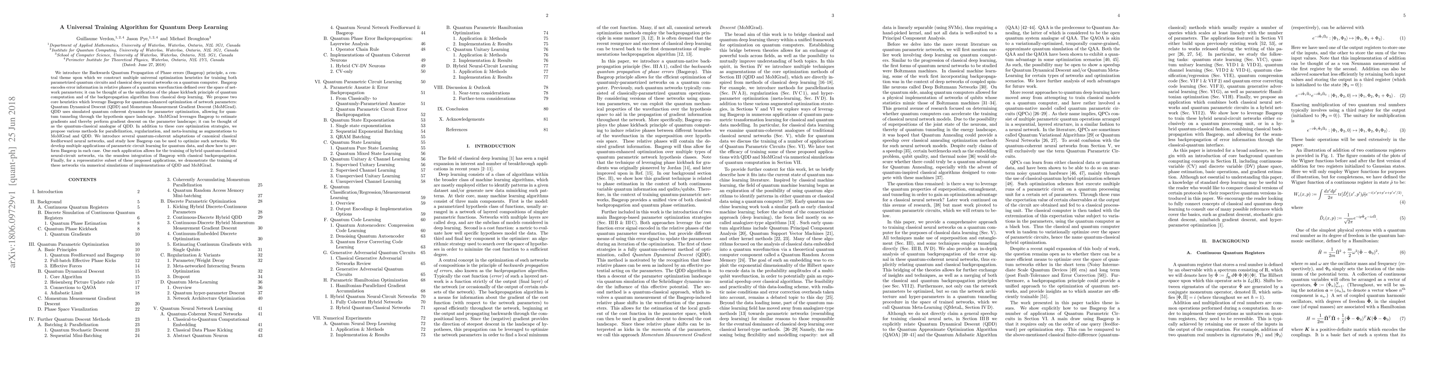 We introduce the Backwards Quantum Propagation of Phase errors (Baqprop) principle, a central theme upon which we construct multiple universal optimization heuristics for training both parametrized quantum circuits and classical deep neural networks on a quantum computer. Baqprop encodes error information in relative phases of a quantum wavefunction defined over the space of network parameters; it can be thought of as the unification of the phase kickback principle of quantum computation and of the backpropagation algorithm from classical deep learning. We propose two core heuristics which leverage Baqprop for quantum-enhanced optimization of network parameters: Quantum Dynamical Descent (QDD) and Momentum Measurement Gradient Descent (MoMGrad). QDD uses simulated quantum coherent dynamics for parameter optimization, allowing for quantum tunneling through the hypothesis space landscape. MoMGrad leverages Baqprop to estimate gradients and thereby perform gradient descent on the parameter landscape; it can be thought of as the quantum-classical analogue of QDD. In addition to these core optimization strategies, we propose various methods for parallelization, regularization, and meta-learning as augmentations to MoMGrad and QDD. We introduce several quantum-coherent adaptations of canonical classical feedforward neural networks, and study how Baqprop can be used to optimize such networks. We develop multiple applications of parametric circuit learning for quantum data, and show how to perform Baqprop in each case. One such application allows for the training of hybrid quantum-classical neural-circuit networks, via the seamless integration of Baqprop with classical backpropagation. Finally, for a representative subset of these proposed applications, we demonstrate the training of these networks via numerical simulations of implementations of QDD and MoMGrad.
