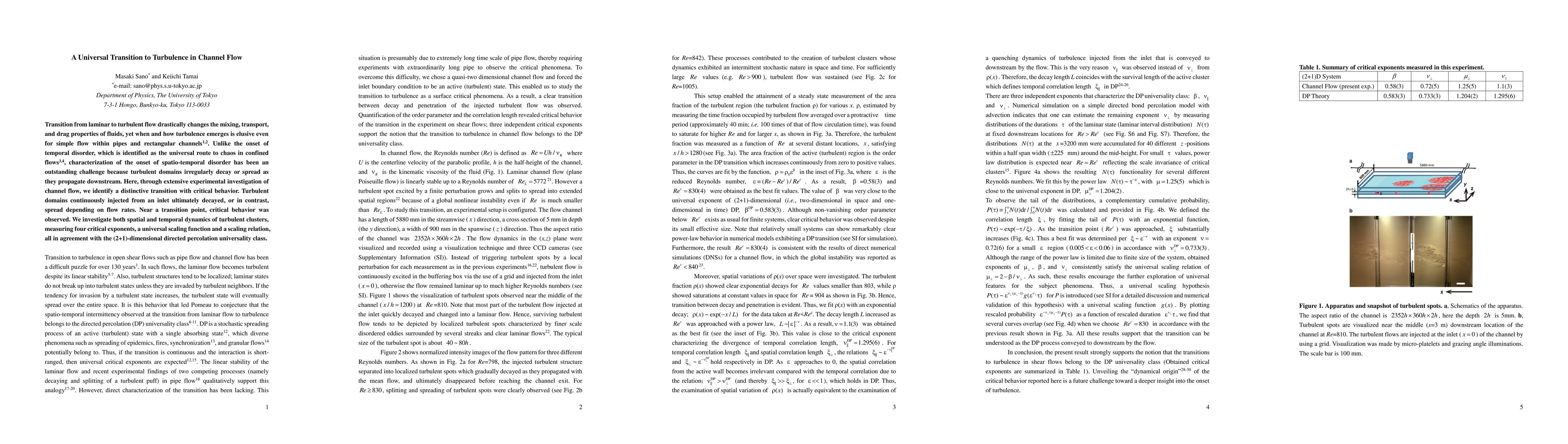 This paper investigates the transition from laminar to turbulent flow in channel flow, identifying a universal route to turbulence characterized by critical behavior and scaling laws consistent with directed percolation. The study reveals how turbulent domains decay or spread based on flow rates, with critical exponents and scaling functions aligning with the (2+1)-dimensional directed percolation model.