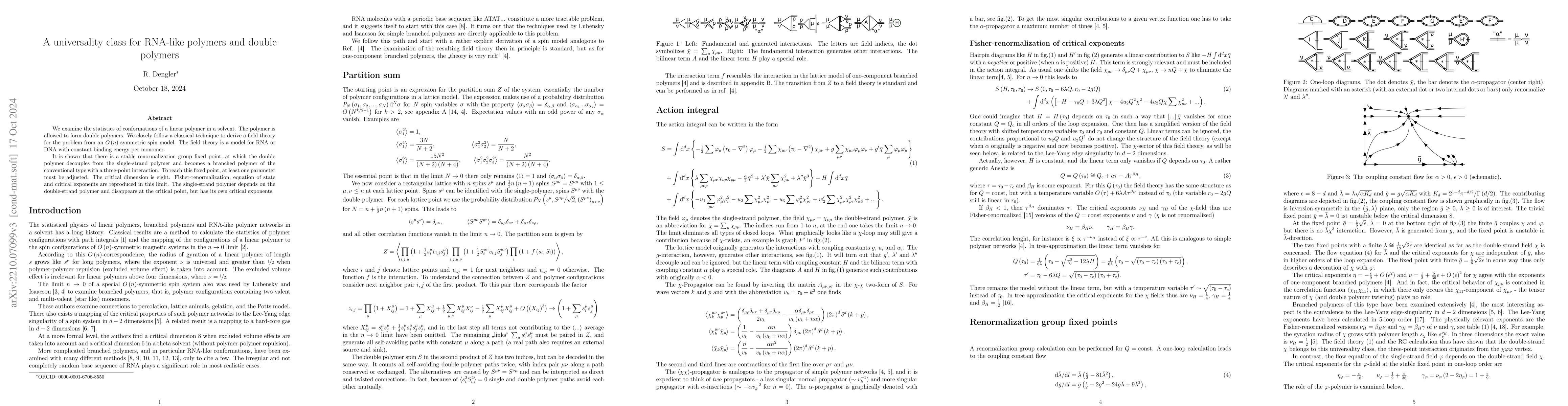 We examine the statistics of conformations of a linear polymer in a solvent. The polymer is allowed to form double polymers. We closely follow a classical technique to derive a field theory for the problem from an $O\left(n\right)$ symmetric spin model. The field theory is a model for RNA or DNA with constant binding energy per monomer. It is shown that there is a stable renormalization group fixed point, at which the double polymer decouples from the single-strand polymer and becomes a branched polymer of the conventional type with a three-point interaction. To reach this fixed point, at least one parameter must be adjusted. The critical dimension is eight. Fisher-renormalization, equation of state and critical exponents are reproduced in this limit. The single-strand polymer depends on the double-strand polymer and disappears at the critical point, but has its own critical exponents.