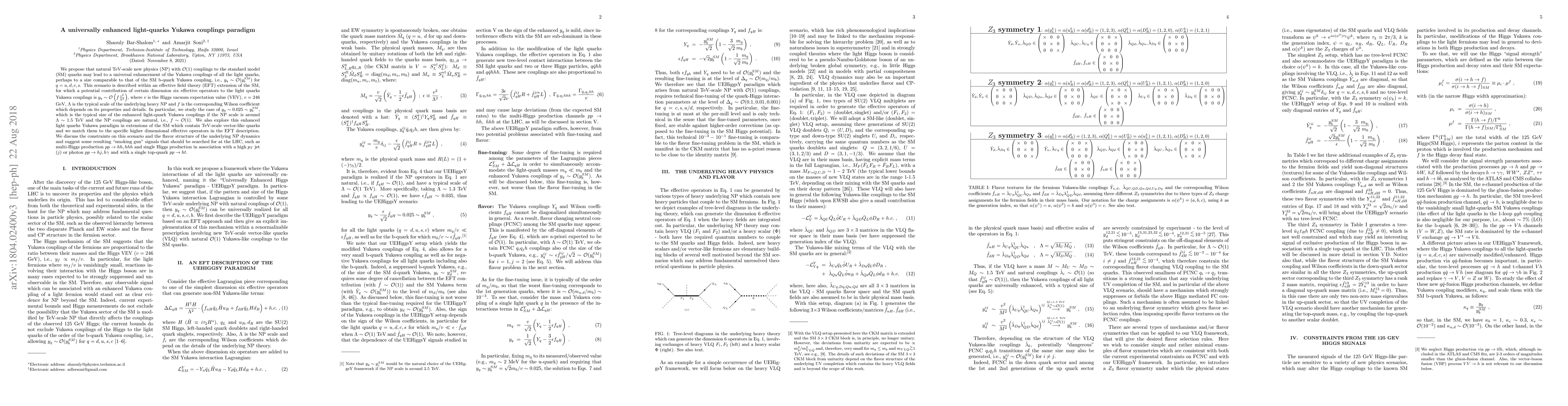 We propose that natural TeV-scale new physics (NP) with ${\cal O}(1)$ couplings to the standard model (SM) quarks may lead to a universal enhancement of the Yukawa couplings of all the light quarks, perhaps to a size comparable to that of the SM b-quark Yukawa coupling, i.e., $y_q \sim {\cal O}(y_b^{SM})$ for $q=u,d,c,s$. This scenario is described within an effective field theory (EFT) extension of the SM, for which a potential contribution of certain dimension six effective operators to the light quarks Yukawa couplings is $y_q \sim {\cal O} \left( f \frac{v^2}{\Lambda^2} \right)$, where $v$ is the Higgs vacuum expectation value (VEV), $v=246$ GeV, $\Lambda$ is the typical scale of the underlying heavy NP and $f$ is the corresponding Wilson coefficient which depends on its properties and details. In particular, we study the case of $y_q \sim 0.025 \sim y_b^{SM}$, which is the typical size of the enhanced light-quark Yukawa couplings if the NP scale is around $\Lambda \sim 1.5$ TeV and the NP couplings are natural, i.e., $f \sim {\cal O}(1)$. We also explore this enhanced light quarks Yukawa paradigm in extensions of the SM which contain TeV-scale vector-like quarks and we match them to the specific higher dimensional effective operators in the EFT description. We discuss the constraints on this scenario and the flavor structure of the underlying NP dynamics and suggest some resulting "smoking gun" signals that should be searched for at the LHC, such as multi-Higgs production $pp \to hh,hhh$ and single Higgs production in association with a high $p_T$ jet ($j$) or photon $pp \to hj,h \gamma$ and with a single top-quark $pp \to h t$.