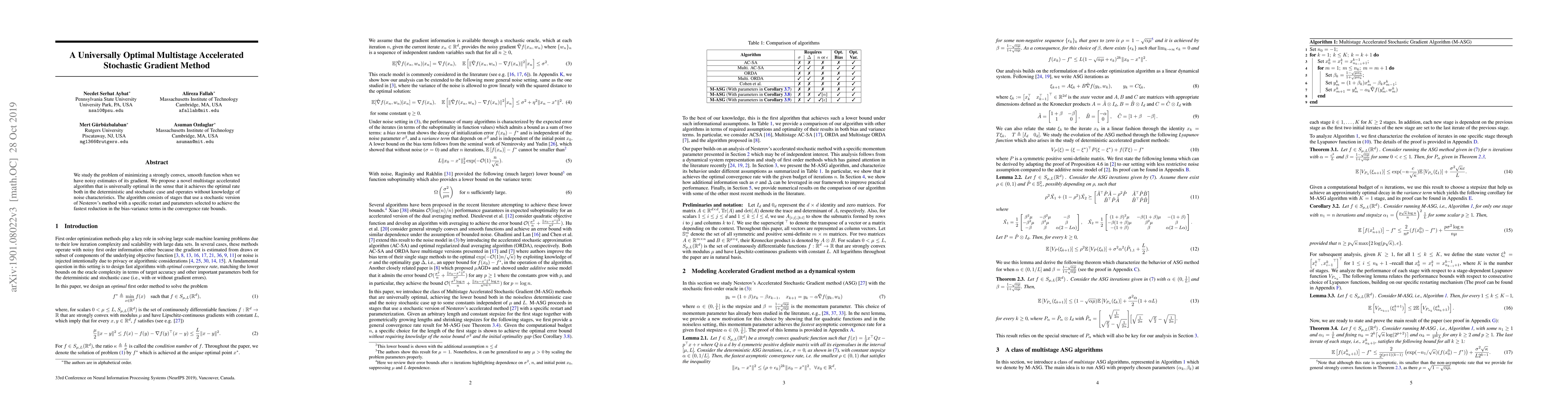 We study the problem of minimizing a strongly convex, smooth function when we have noisy estimates of its gradient. We propose a novel multistage accelerated algorithm that is universally optimal in the sense that it achieves the optimal rate both in the deterministic and stochastic case and operates without knowledge of noise characteristics. The algorithm consists of stages that use a stochastic version of Nesterov's method with a specific restart and parameters selected to achieve the fastest reduction in the bias-variance terms in the convergence rate bounds.