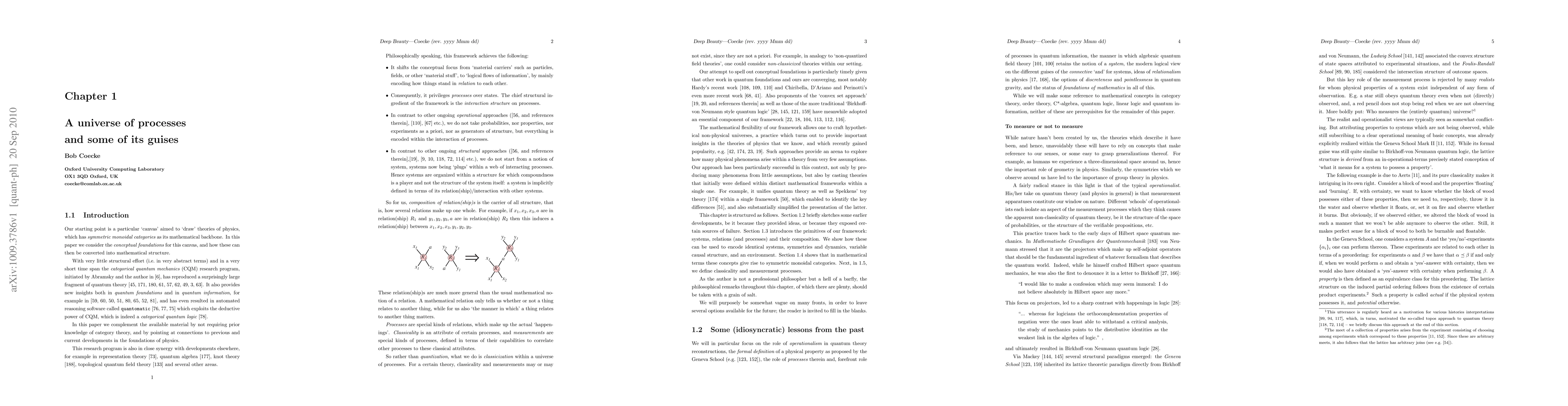 Our starting point is a particular `canvas' aimed to `draw' theories of physics, which has symmetric monoidal categories as its mathematical backbone. In this paper we consider the conceptual foundations for this canvas, and how these can then be converted into mathematical structure. With very little structural effort (i.e. in very abstract terms) and in a very short time span the categorical quantum mechanics (CQM) research program has reproduced a surprisingly large fragment of quantum theory. It also provides new insights both in quantum foundations and in quantum information, and has even resulted in automated reasoning software called `quantomatic' which exploits the deductive power of CQM. In this paper we complement the available material by not requiring prior knowledge of category theory, and by pointing at connections to previous and current developments in the foundations of physics. This research program is also in close synergy with developments elsewhere, for example in representation theory, quantum algebra, knot theory, topological quantum field theory and several other areas.