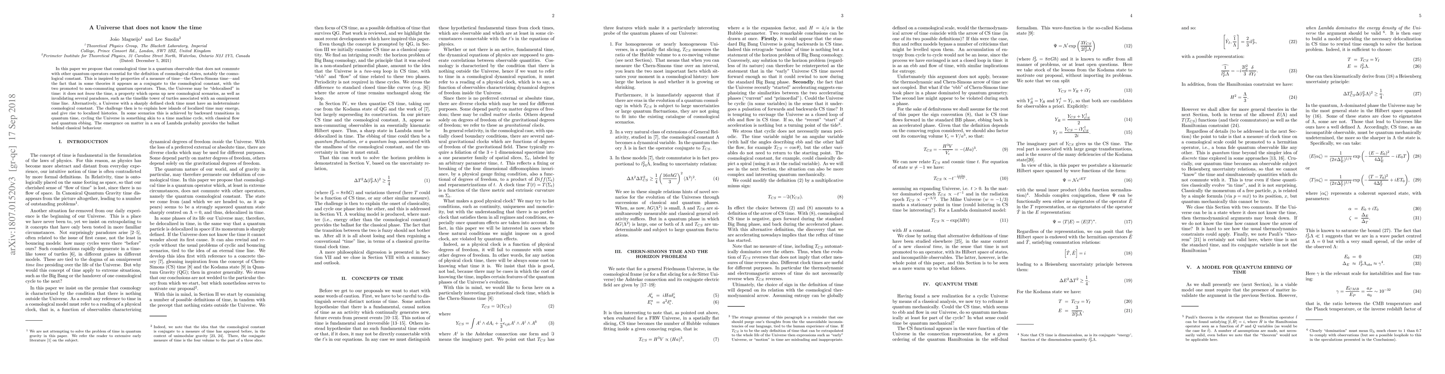 In this paper we propose that cosmological time is a quantum observable that does not commute with other quantum operators essential for the definition of cosmological states, notably the cosmological constant. This is inspired by properties of a measure of time---the Chern-Simons time---and the fact that in some theories it appears as a conjugate to the cosmological constant, with the two promoted to non-commuting quantum operators. Thus, the Universe may be "delocalised" in time: it does not {\it know} the time, a property which opens up new cosmological scenarios, as well as invalidating several paradoxes, such as the timelike tower of turtles associated with an omnipresent time line. Alternatively, a Universe with a sharply defined clock time must have an indeterminate cosmological constant. The challenge then is to explain how islands of localized time may emerge, and give rise to localized histories. In some scenarios this is achieved by backward transitions in quantum time, cycling the Universe in something akin to a time machine cycle, with classical flow and quantum ebbing. The emergence on matter in a sea of Lambda probably provides the ballast behind classical behaviour.