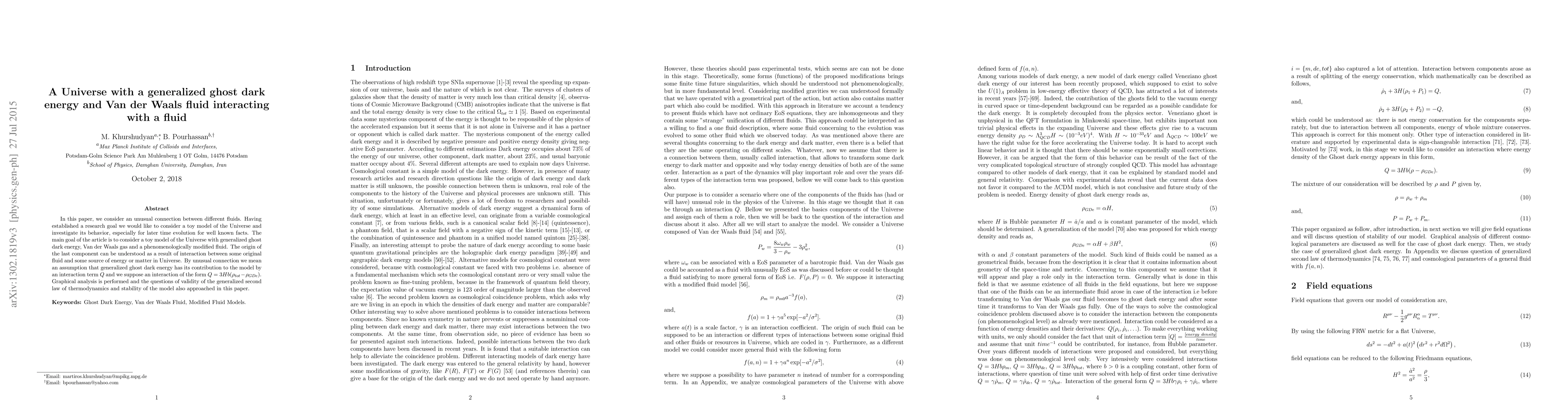 In this paper, we consider an unusual connection between different fluids. Having established a research goal we would like to consider a toy model of the Universe and investigate its behavior, especially for later time evolution for well known facts. The main goal of the article is to consider a toy model of the Universe with generalized ghost dark energy, Van der Waals gas and a phenomenologically modified fluid. The origin of the last component can be understood as a result of interaction between some original fluid and some source of energy or matter in Universe. By unusual connection we mean an assumption that generalized ghost dark energy has its contribution to the model by an interaction term $Q$ and we suppose an interaction of the form $Q=3Hb(\rho_{\small{tot}}-\rho_{GDe})$. Graphical analysis is performed and the questions of validity of the generalized second law of thermodynamics and stability of the model also approached in this paper.