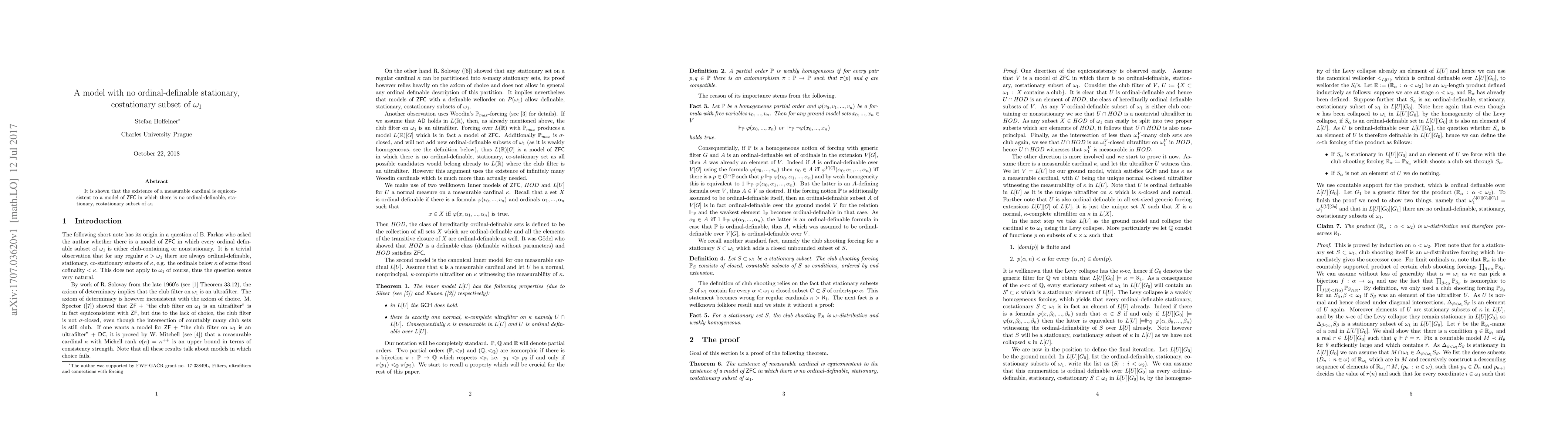 It is shown that the existence of a measurable cardinal is equiconsistent to a model of ZFC in which there is no ordinal-definable, stationary, costationary subset of $\omega_1$
