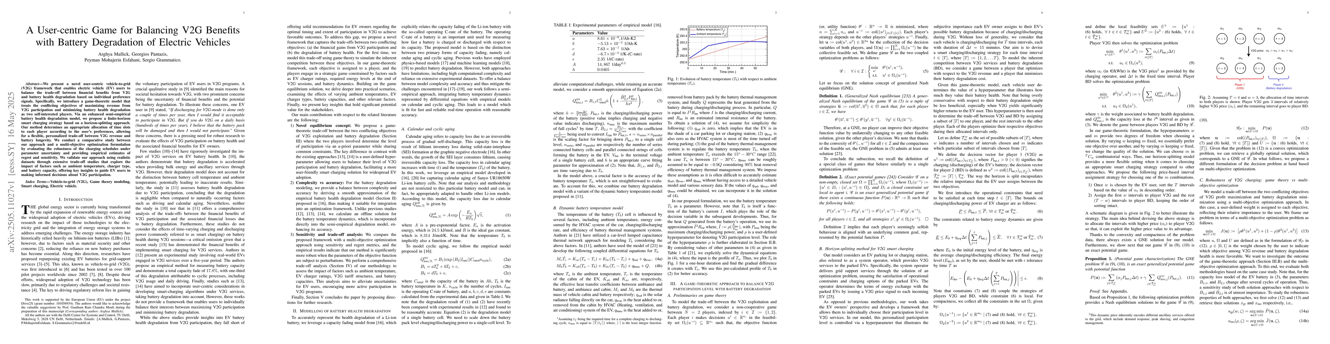 The paper presents a novel user-centric game framework for balancing V2G benefits and battery degradation, incorporating individual preference signals.