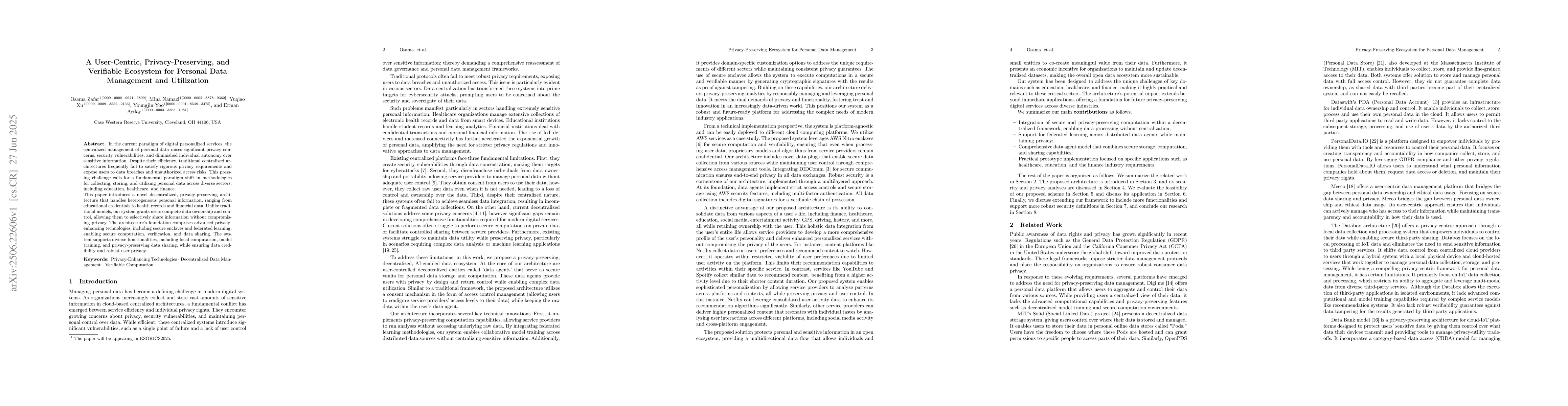 In the current paradigm of digital personalized services, the centralized management of personal data raises significant privacy concerns, security vulnerabilities, and diminished individual autonomy over sensitive information. Despite their efficiency, traditional centralized architectures frequently fail to satisfy rigorous privacy requirements and expose users to data breaches and unauthorized access risks. This pressing challenge calls for a fundamental paradigm shift in methodologies for collecting, storing, and utilizing personal data across diverse sectors, including education, healthcare, and finance. This paper introduces a novel decentralized, privacy-preserving architecture that handles heterogeneous personal information, ranging from educational credentials to health records and financial data. Unlike traditional models, our system grants users complete data ownership and control, allowing them to selectively share information without compromising privacy. The architecture's foundation comprises advanced privacy-enhancing technologies, including secure enclaves and federated learning, enabling secure computation, verification, and data sharing. The system supports diverse functionalities, including local computation, model training, and privacy-preserving data sharing, while ensuring data credibility and robust user privacy.