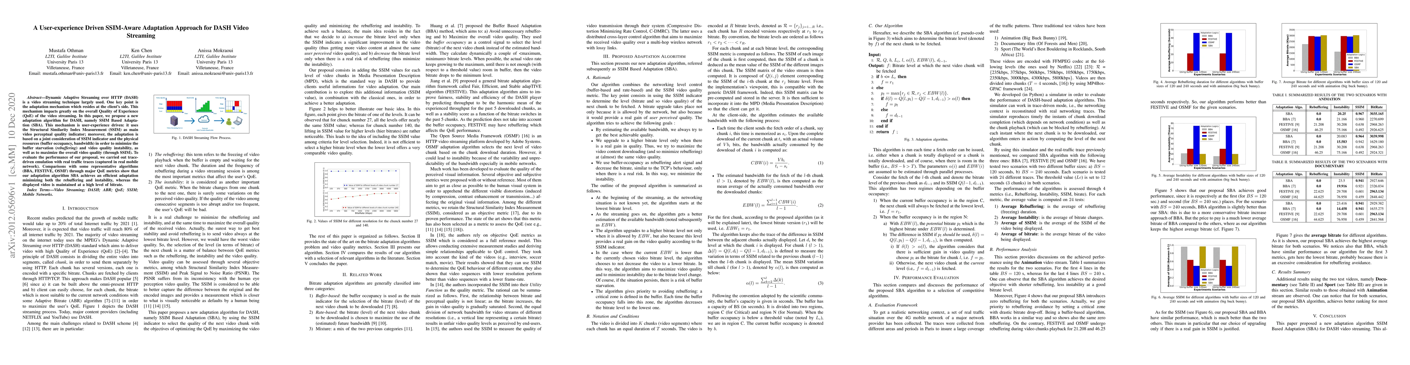 This paper proposes a user-experience driven SSIM Based Adaptation (SBA) algorithm for DASH video streaming, utilizing the Structural Similarity Index Measurement (SSIM) as a perceptual quality indicator. The algorithm aims to minimize rebuffering and maintain high video quality by jointly considering SSIM and physical resource conditions.