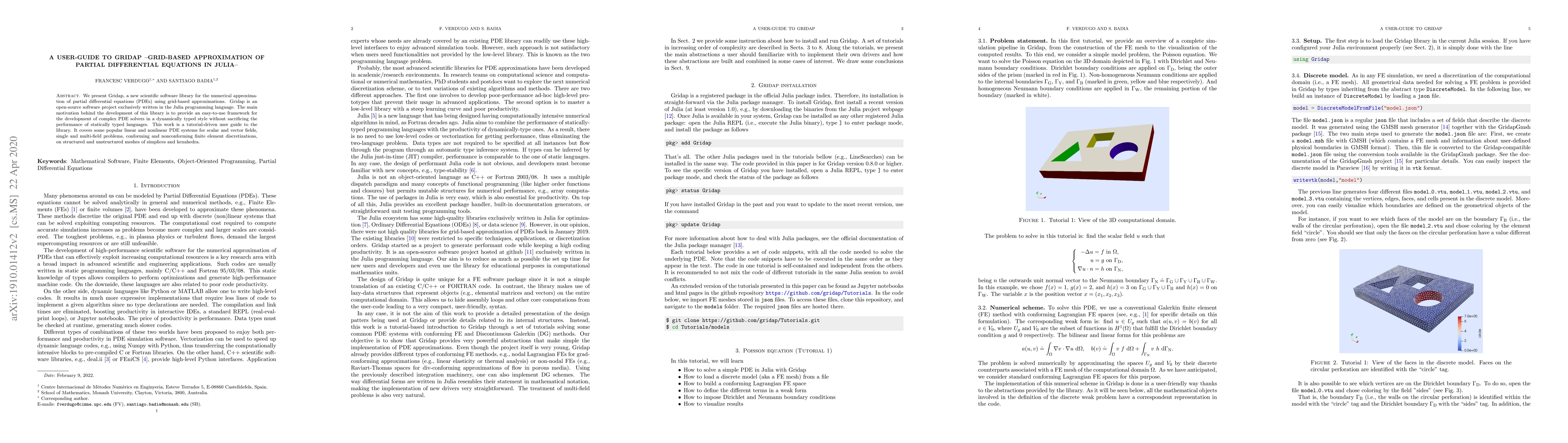 Gridap is a Julia-based open-source library for numerically solving partial differential equations using grid-based approximations. This user guide provides a tutorial-driven introduction to the library, demonstrating its application for various linear and nonlinear PDE systems across different types of meshes and discretizations.