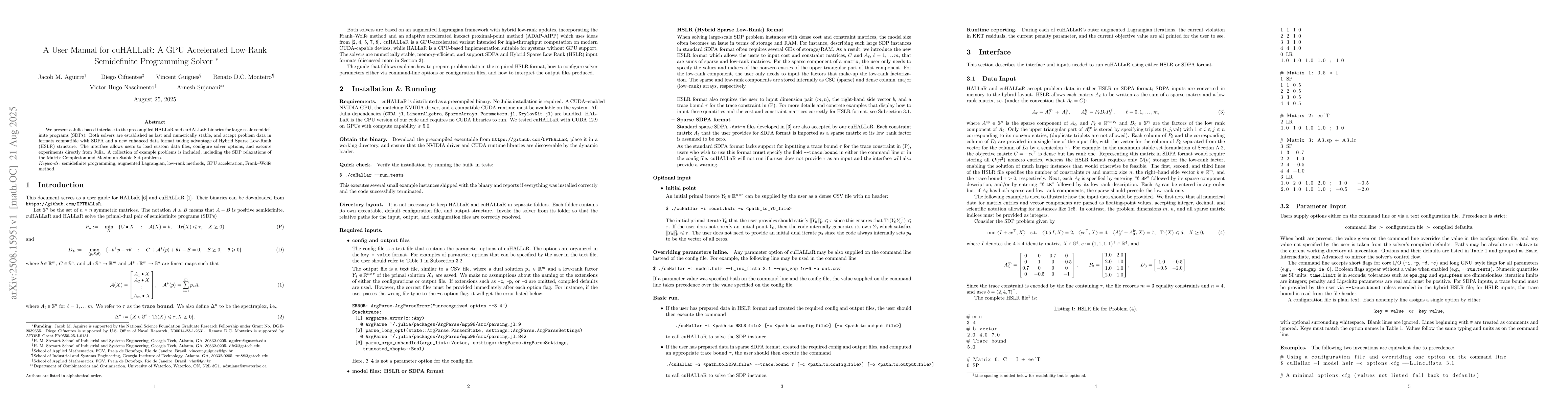 We present a Julia-based interface to the precompiled HALLaR and cuHALLaR binaries for large-scale semidefinite programs (SDPs). Both solvers are established as fast and numerically stable, and accept problem data in formats compatible with SDPA and a new enhanced data format taking advantage of Hybrid Sparse Low-Rank (HSLR) structure. The interface allows users to load custom data files, configure solver options, and execute experiments directly from Julia. A collection of example problems is included, including the SDP relaxations of the Matrix Completion and Maximum Stable Set problems.