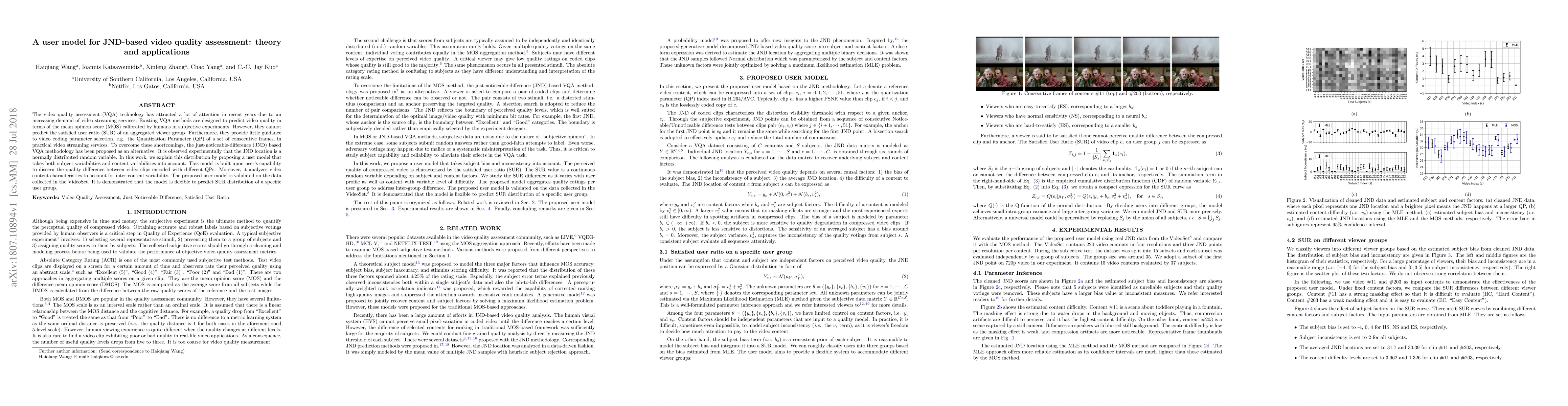 This paper proposes a JND-based user model for video quality assessment that predicts the satisfied user ratio (SUR) of viewer groups and aids in video coding parameter selection. The model accounts for both subject and content variabilities, validated on VideoSet data, and demonstrates flexibility in predicting SUR distribution.