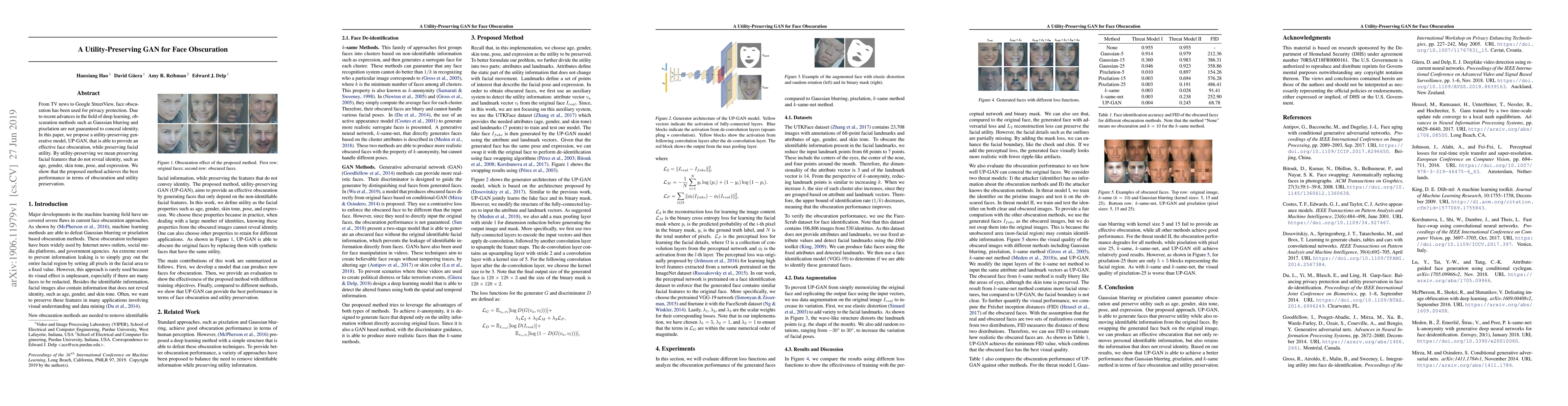 From TV news to Google StreetView, face obscuration has been used for privacy protection. Due to recent advances in the field of deep learning, obscuration methods such as Gaussian blurring and pixelation are not guaranteed to conceal identity. In this paper, we propose a utility-preserving generative model, UP-GAN, that is able to provide an effective face obscuration, while preserving facial utility. By utility-preserving we mean preserving facial features that do not reveal identity, such as age, gender, skin tone, pose, and expression. We show that the proposed method achieves the best performance in terms of obscuration and utility preservation.