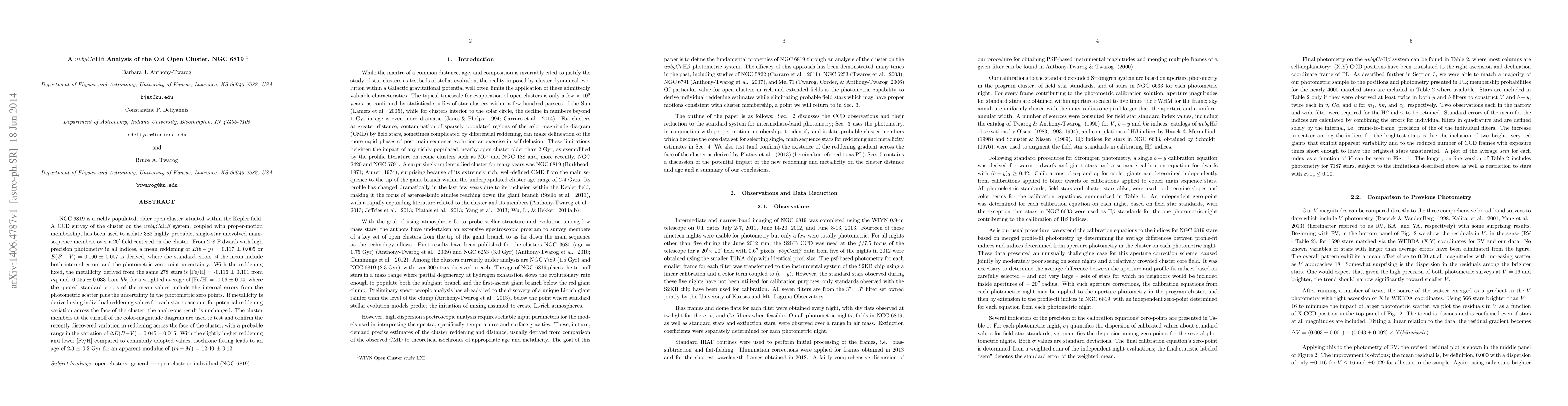 This paper analyzes NGC 6819, an older open cluster, using uvbyCaHbeta photometry and proper-motion membership to identify 382 main-sequence stars. It derives a mean reddening of E(B-V) = 0.160 +/- 0.007 and a metallicity of [Fe/H] = -0.06 +/- 0.04, leading to an estimated age of 2.3 +/- 0.2 Gyr.