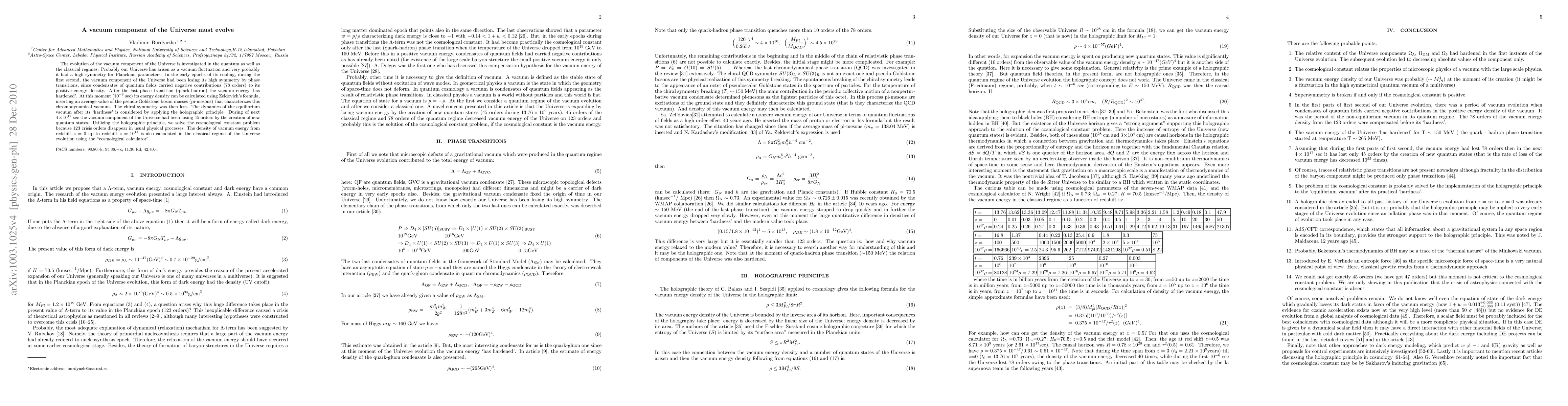 This paper investigates the evolution of the vacuum component of the Universe, exploring quantum and classical regimes. It posits that the Universe's vacuum energy density has decreased significantly over time due to phase transitions and new quantum state organization, resolving issues like the cosmological constant problem and the 123 crisis.