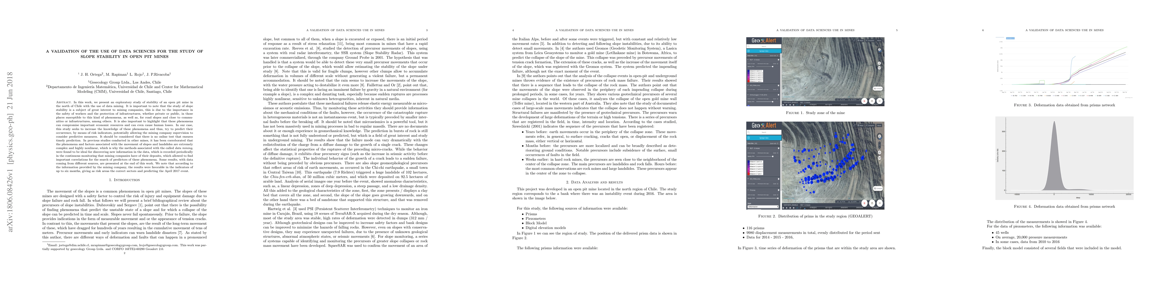 This study uses data mining to predict slope stability in open pit mines, with favorable results for up to six months, identifying risk areas and predicting a 2017 event.